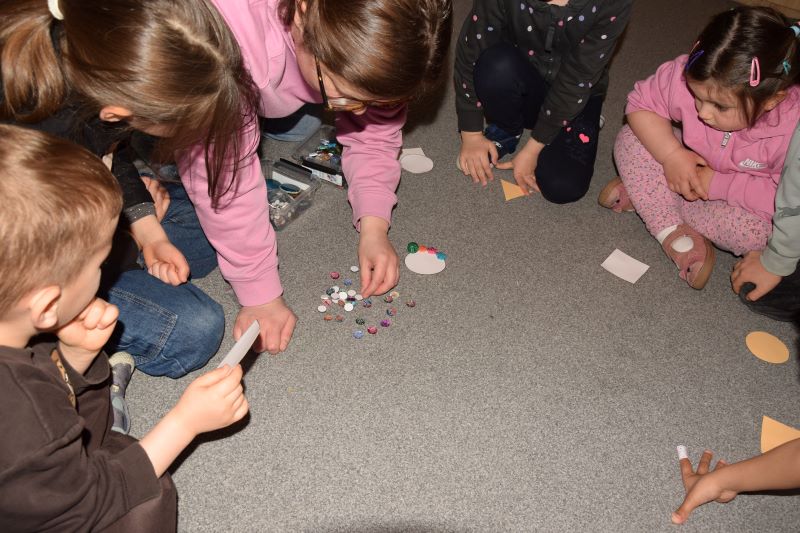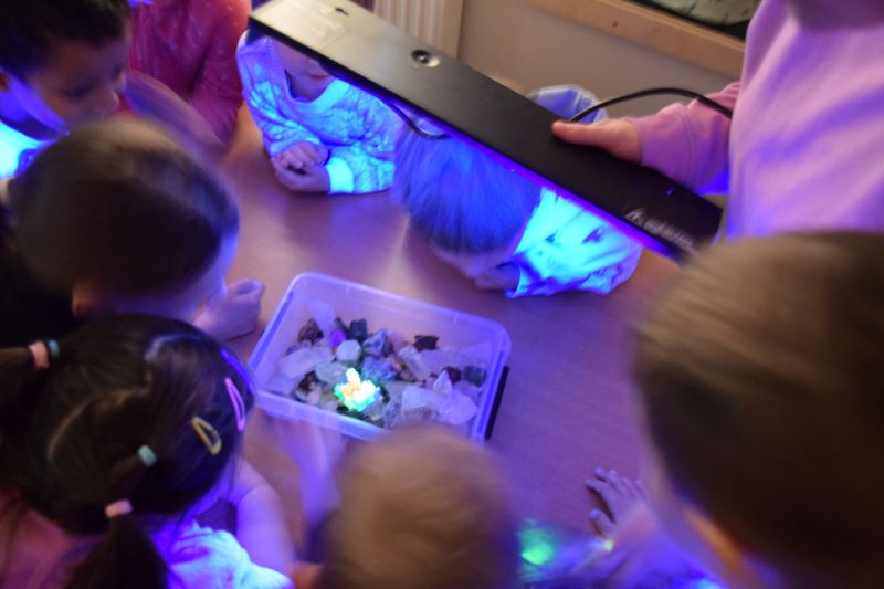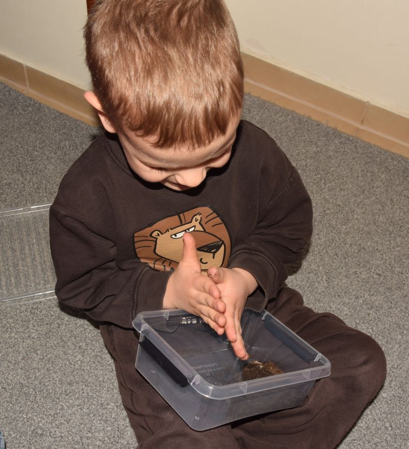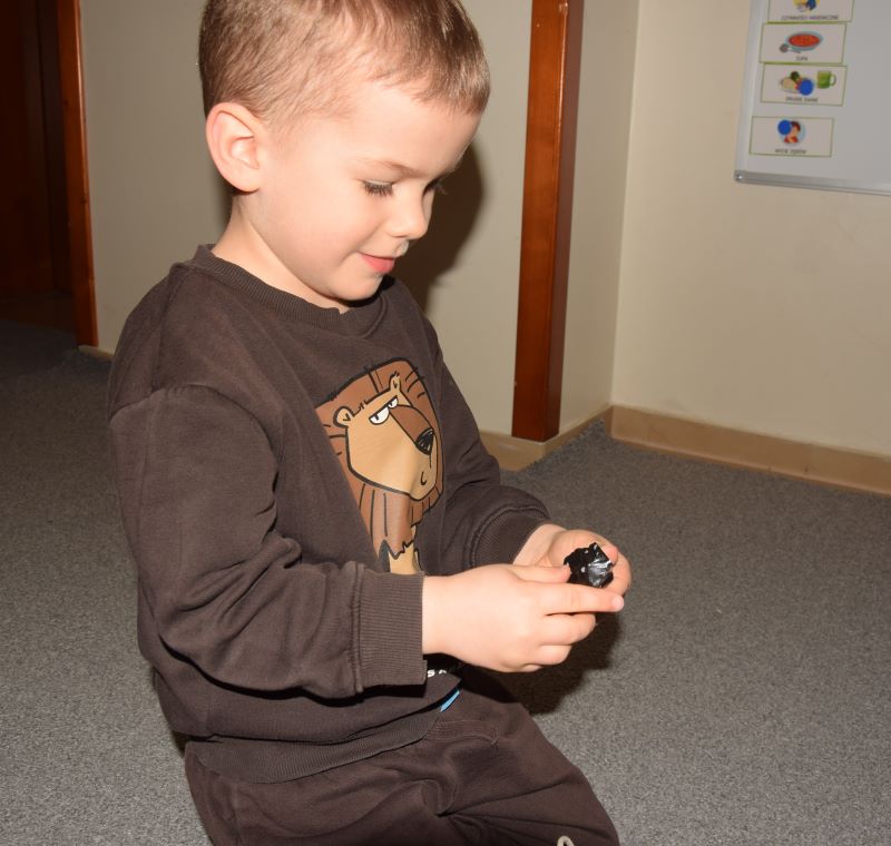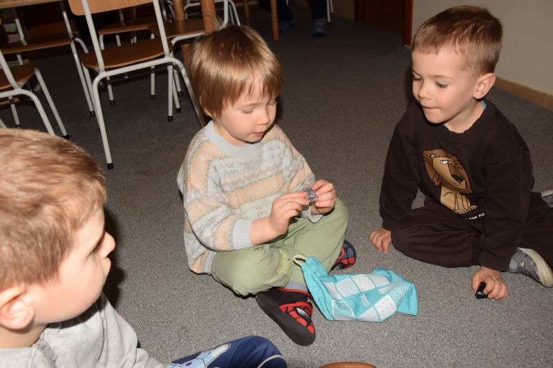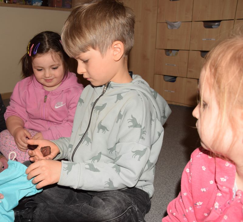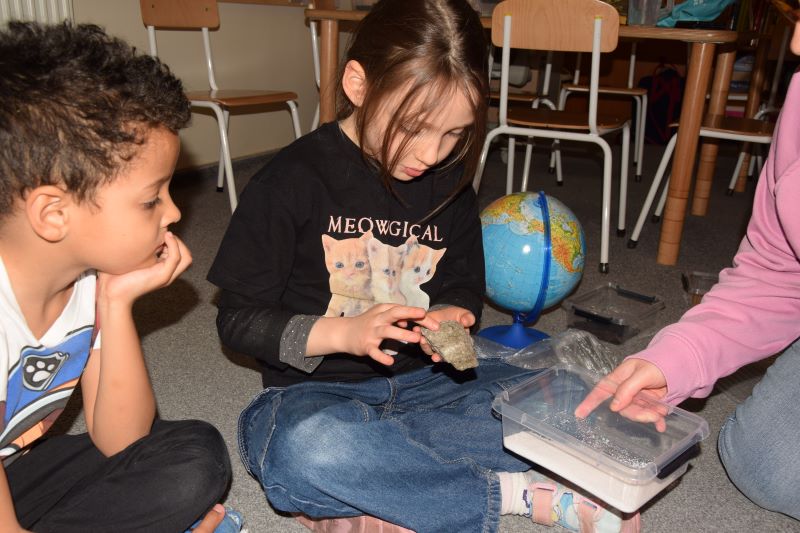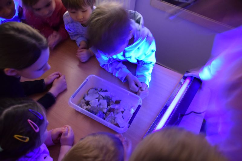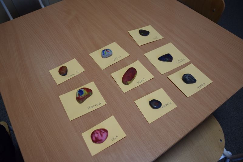 Tematem przewodnim obecnego tygodnia w grupie „Iskierek” są żywioły. Dziś poznawaliśmy, jakie skarby skrywa nasza planeta Ziemia. Dowiadywaliśmy się skąd pochodzi sól, węgiel, piasek, glina oraz jakie mają one zastosowanie w naszym życiu. Za pomocą zmysłu dotyku i wzroku poznawaliśmy ich faktury i opisywaliśmy nasze wrażenie po kontakcie z materiałami przyrodniczymi. Obcowaliśmy także ze szczególnymi skarbami naszej planety – kamieniami i minerałami. Z różnorodnych kamieni i kamyczków stworzyliśmy własne geometryczne mozaiki. Obserwowaliśmy także zjawisko luminescencji, czyli szczególną właściwość, jaką posiadają wybrane kamienie szlachetne. Na zakończenie zajęć każda „Iskierka” za pomocą farb ozdobiła swój własny, niepowtarzalny kamień.