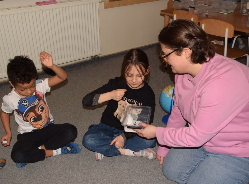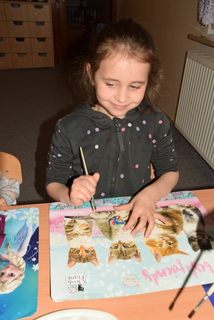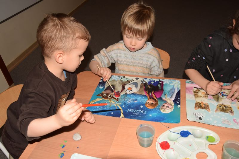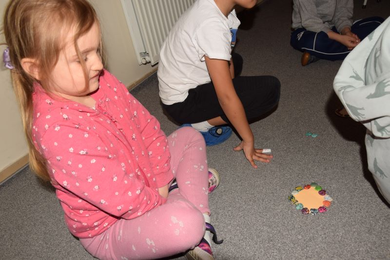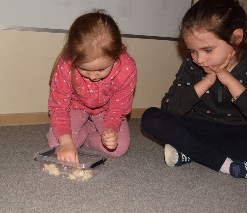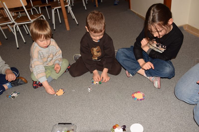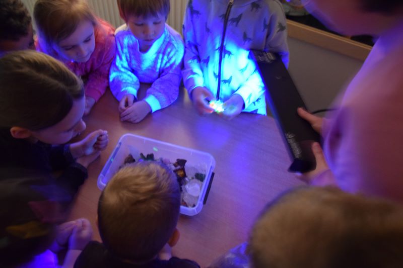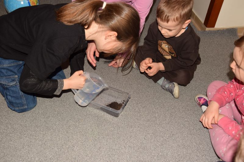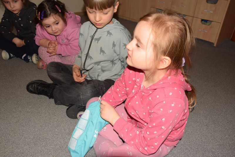 Tematem przewodnim obecnego tygodnia w grupie „Iskierek” są żywioły. Dziś poznawaliśmy, jakie skarby skrywa nasza planeta Ziemia. Dowiadywaliśmy się skąd pochodzi sól, węgiel, piasek, glina oraz jakie mają one zastosowanie w naszym życiu. Za pomocą zmysłu dotyku i wzroku poznawaliśmy ich faktury i opisywaliśmy nasze wrażenie po kontakcie z materiałami przyrodniczymi. Obcowaliśmy także ze szczególnymi skarbami naszej planety – kamieniami i minerałami. Z różnorodnych kamieni i kamyczków stworzyliśmy własne geometryczne mozaiki. Obserwowaliśmy także zjawisko luminescencji, czyli szczególną właściwość, jaką posiadają wybrane kamienie szlachetne. Na zakończenie zajęć każda „Iskierka” za pomocą farb ozdobiła swój własny, niepowtarzalny kamień.