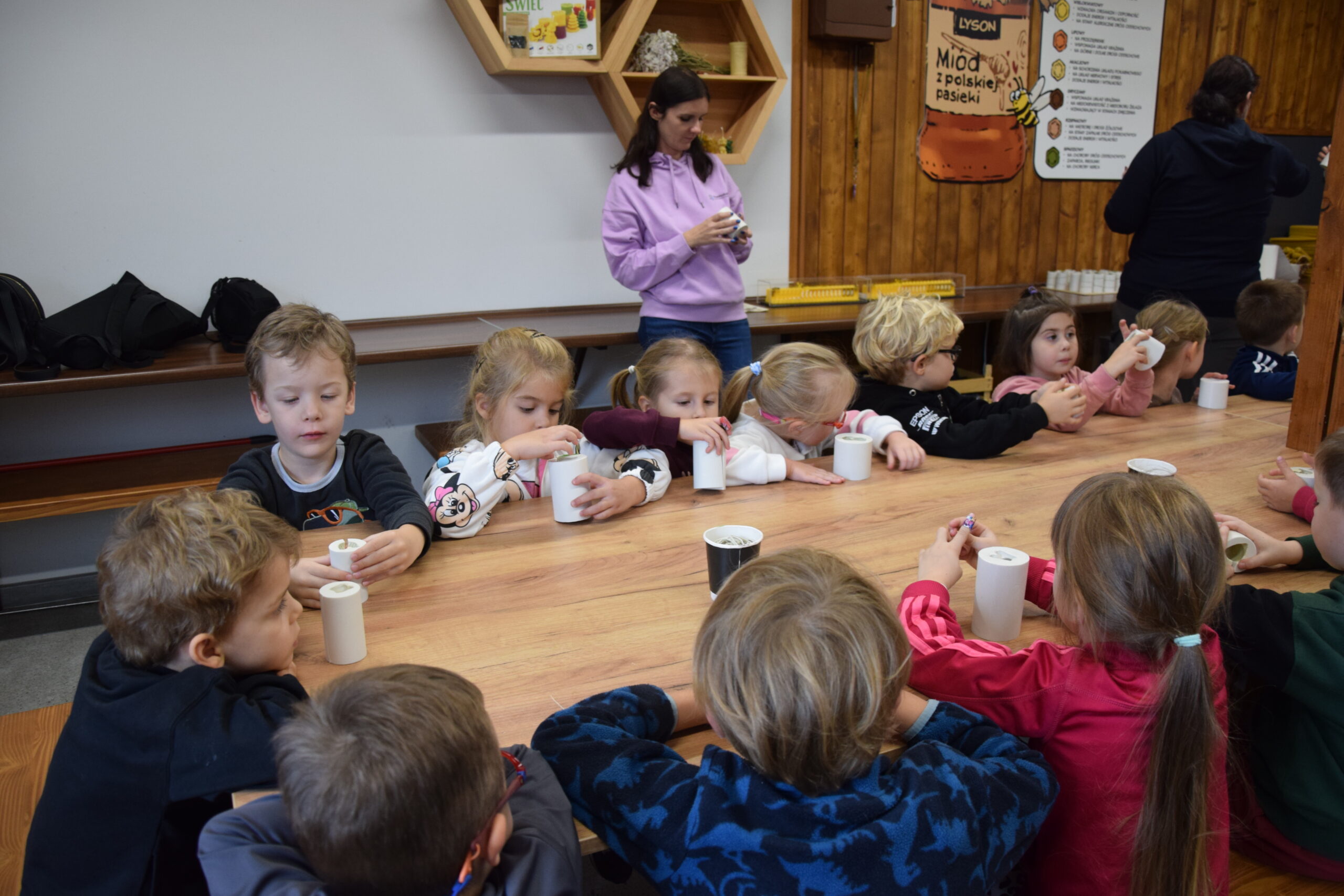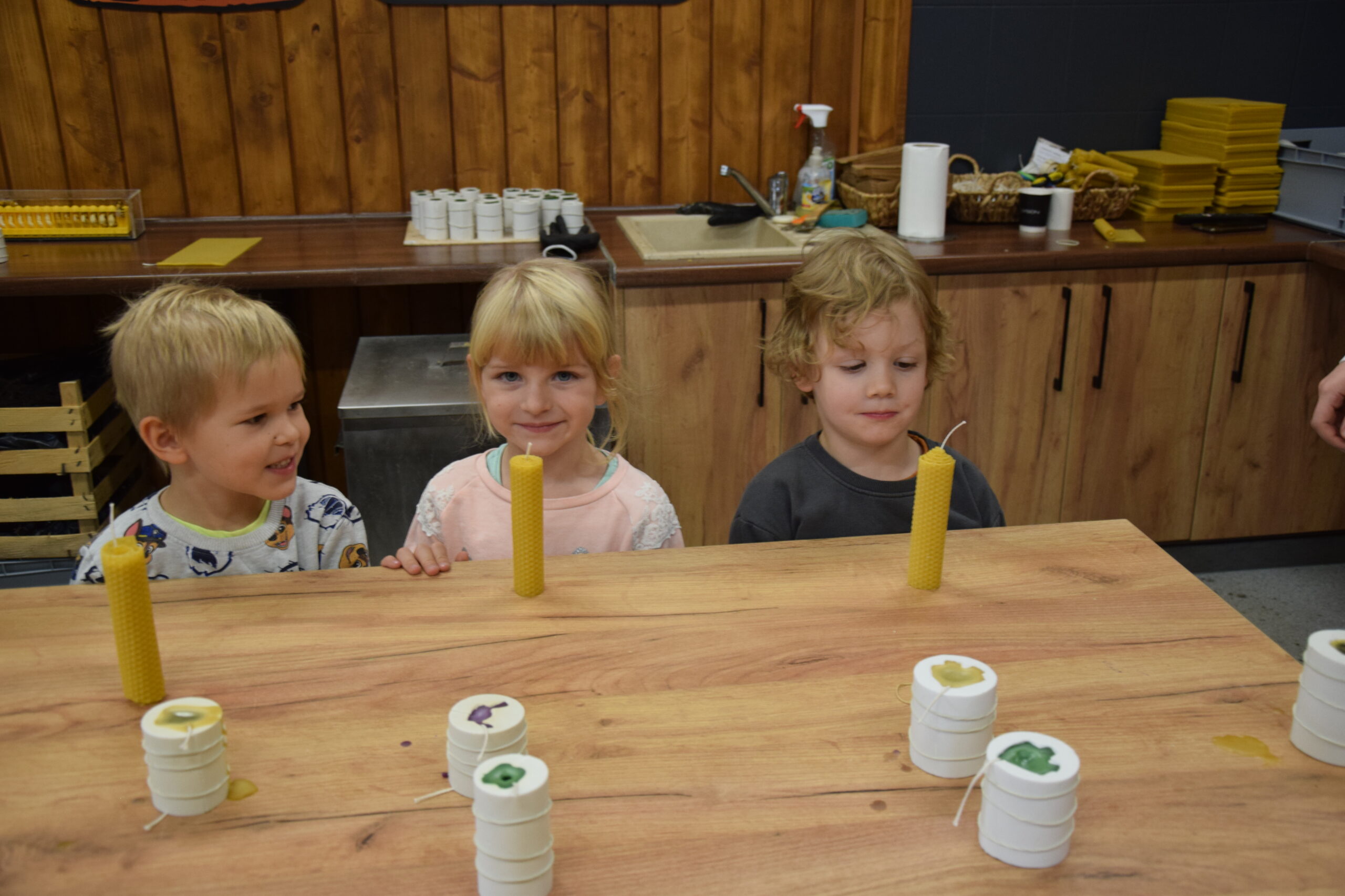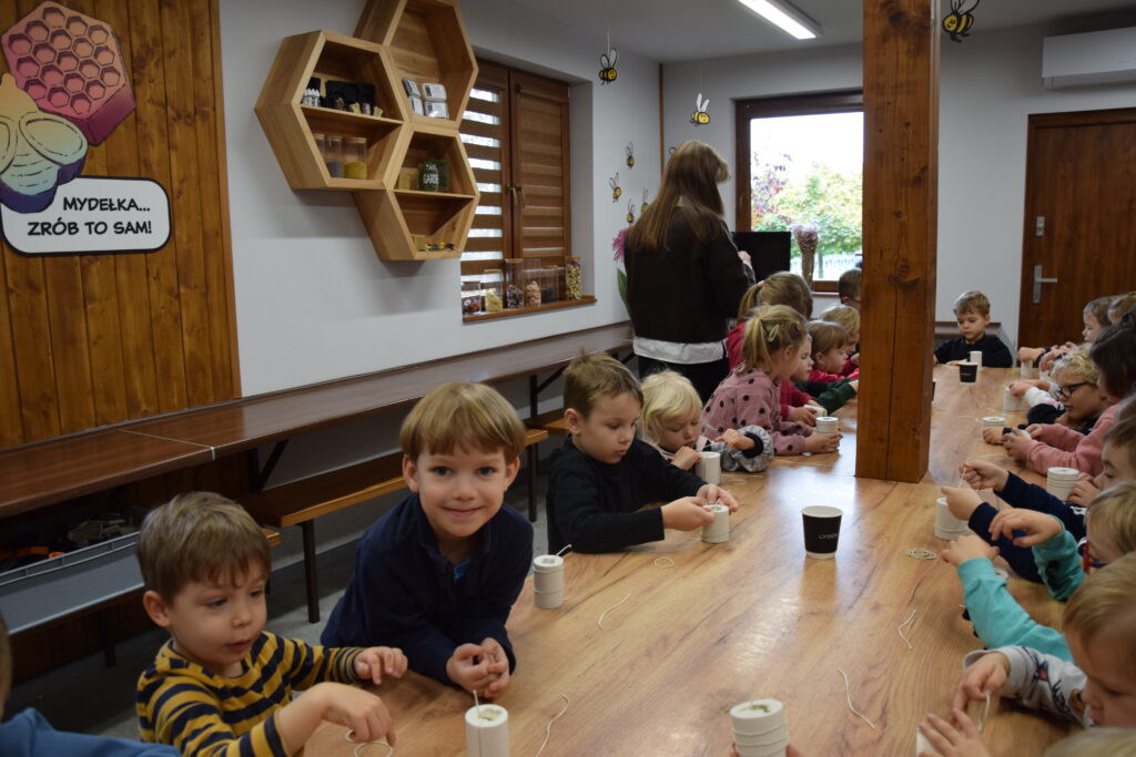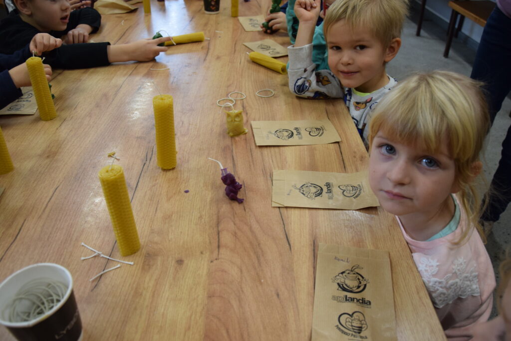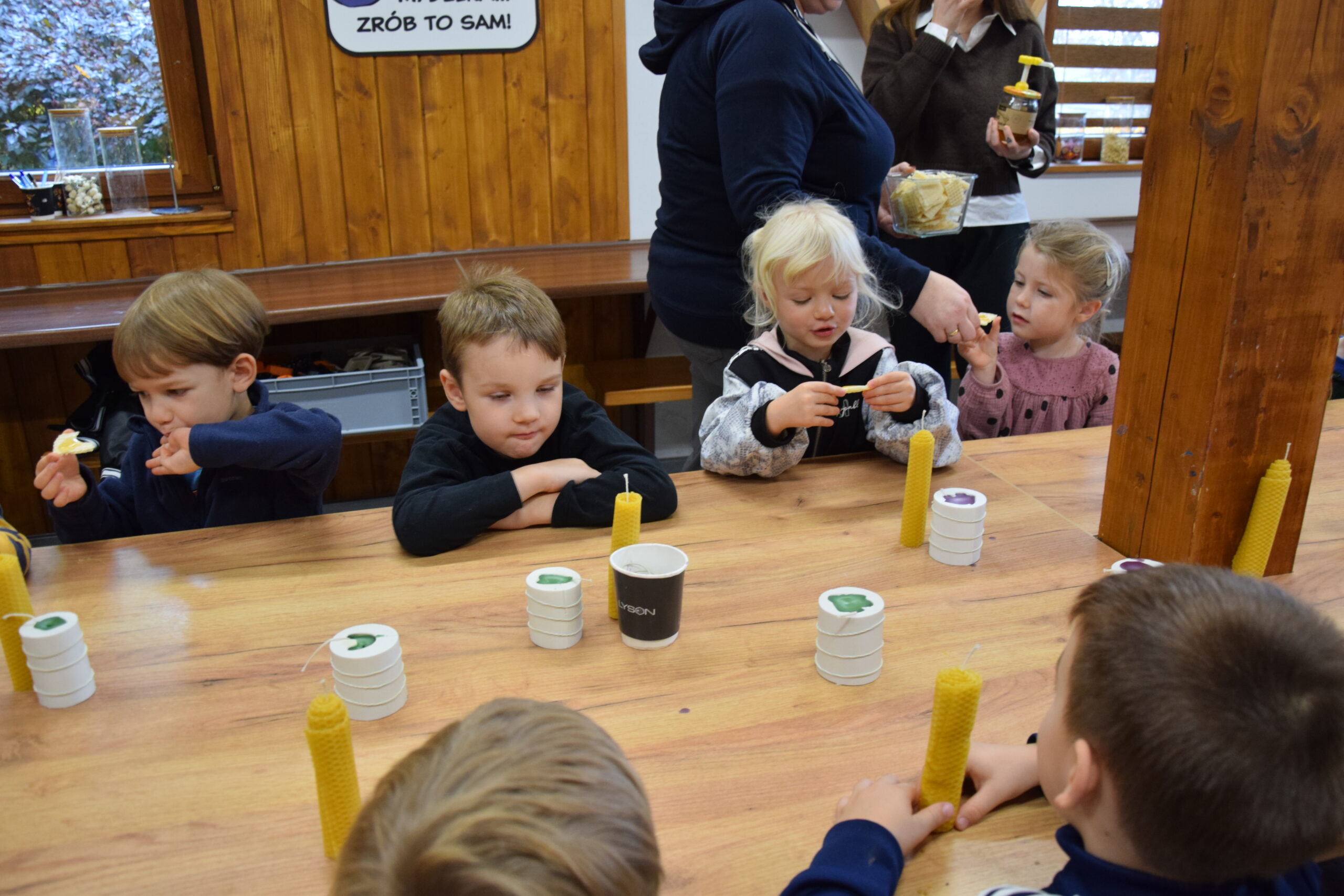 Grupa „Kamyczków” i „Kropelek” wybrała się do Apilandii – krainy pszczół. Przedszkolaki uczestniczyły w warsztatach robienia świec z wosku lanego i więzy pszczelej oraz degustacji pszczelich wyrobów. Dzieci zwiedzały także muzeum pszczelarskie i oglądały pszczoły w przeszklonym ulu.