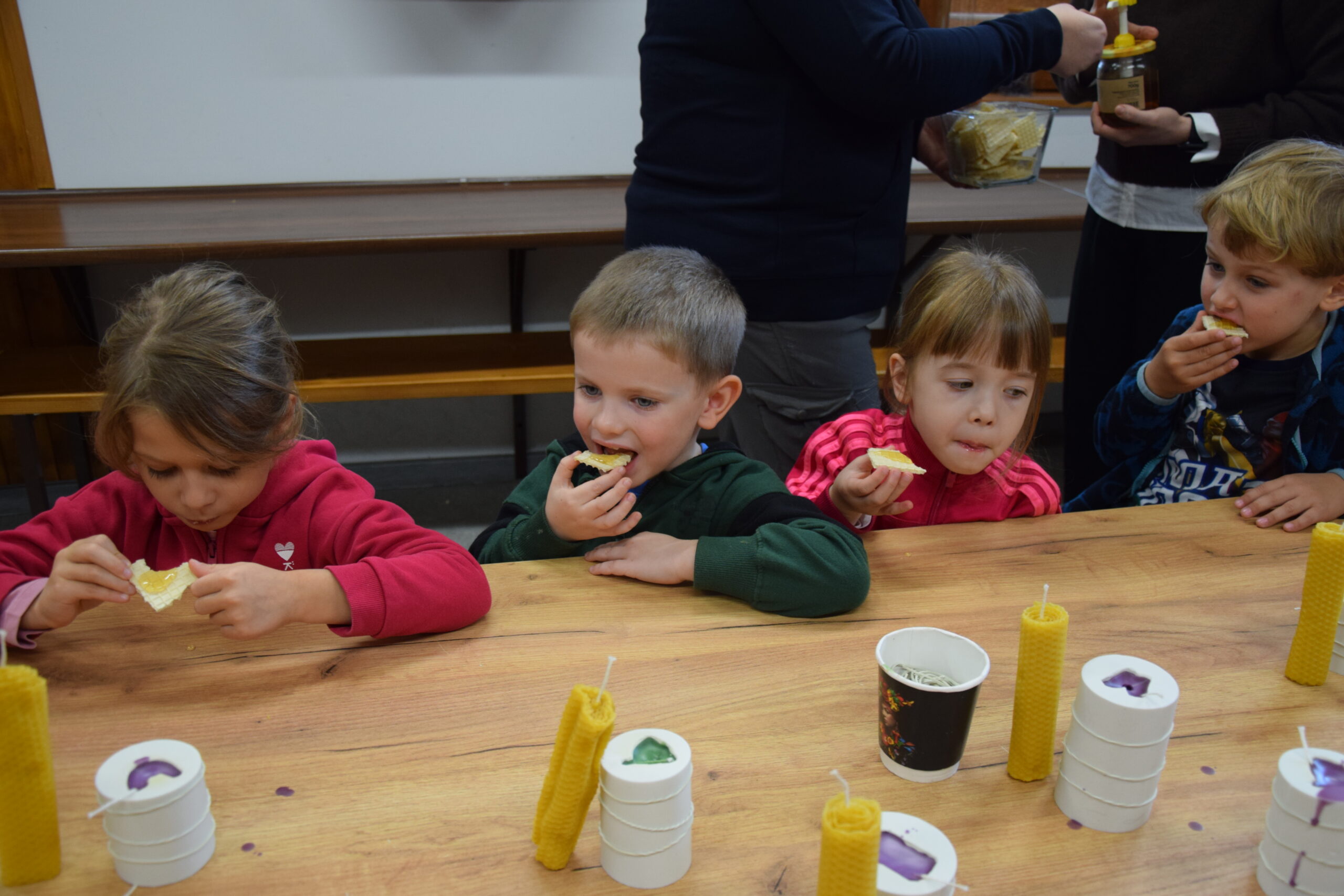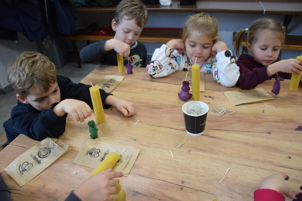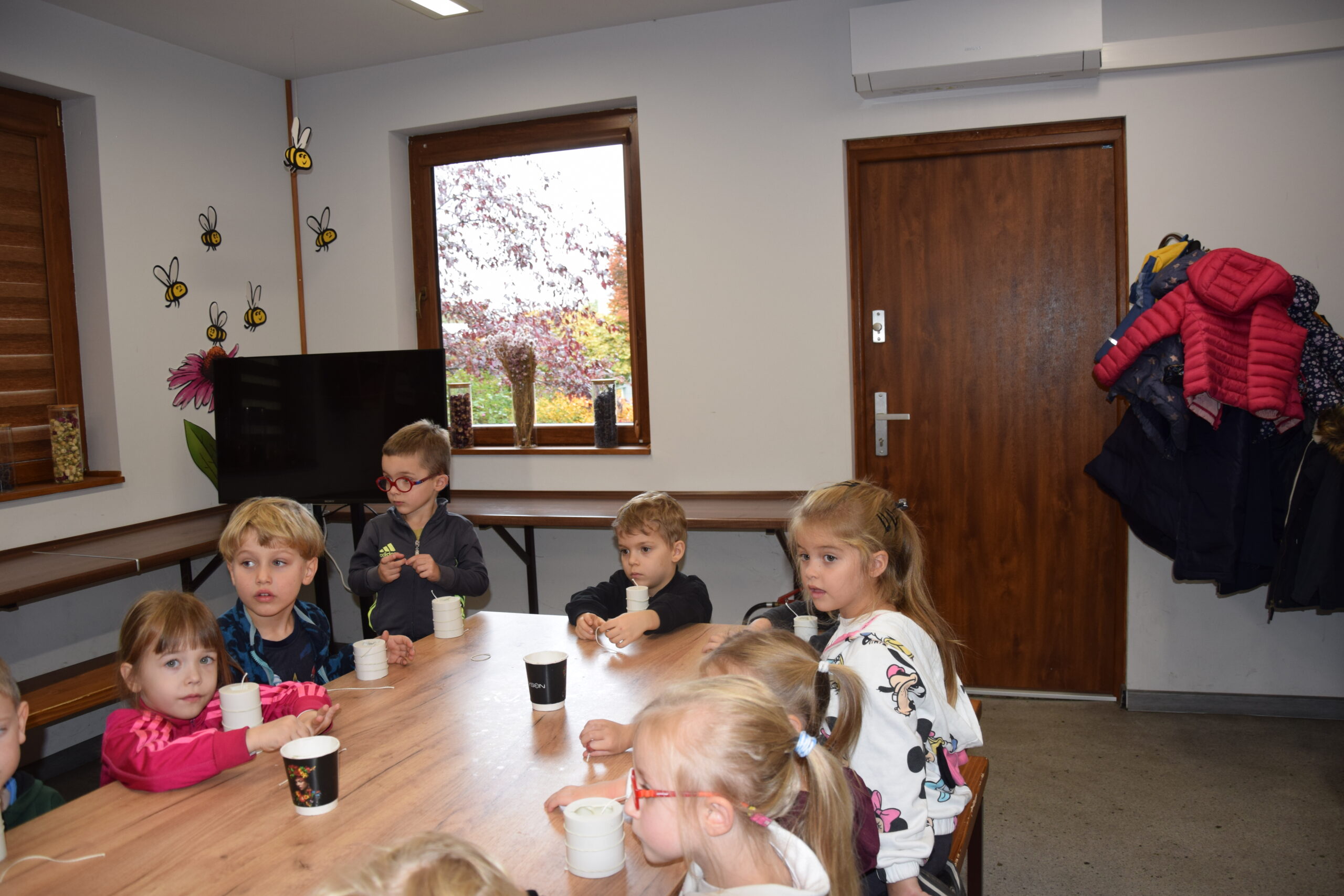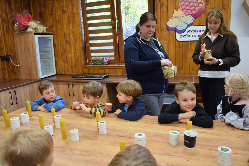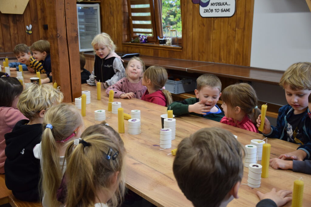 Grupa „Kamyczków” i „Kropelek” wybrała się do Apilandii – krainy pszczół. Przedszkolaki uczestniczyły w warsztatach robienia świec z wosku lanego i więzy pszczelej oraz degustacji pszczelich wyrobów. Dzieci zwiedzały także muzeum pszczelarskie i oglądały pszczoły w przeszklonym ulu.