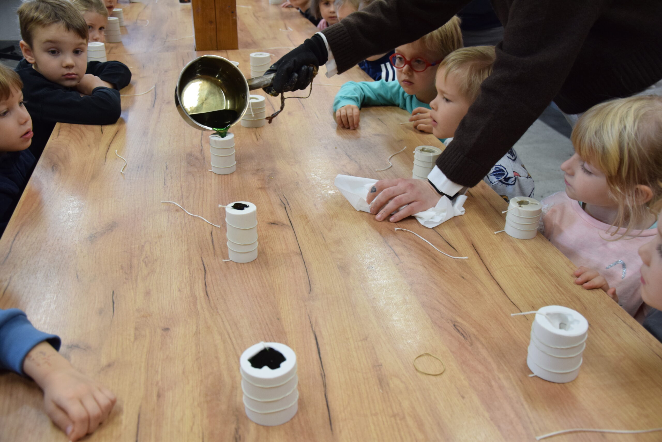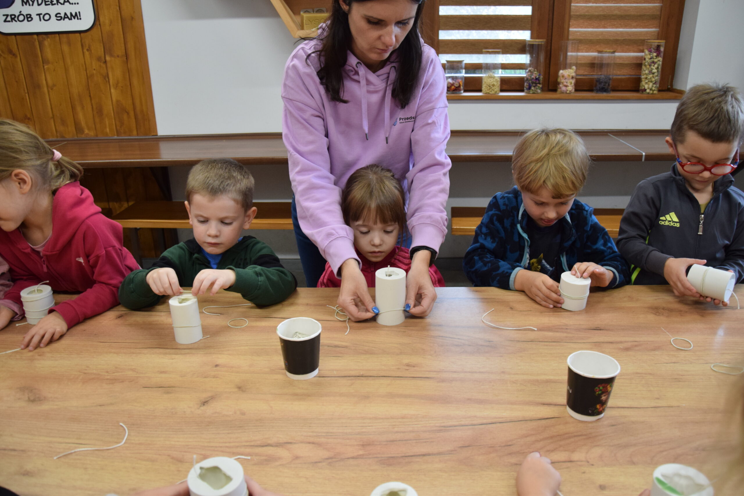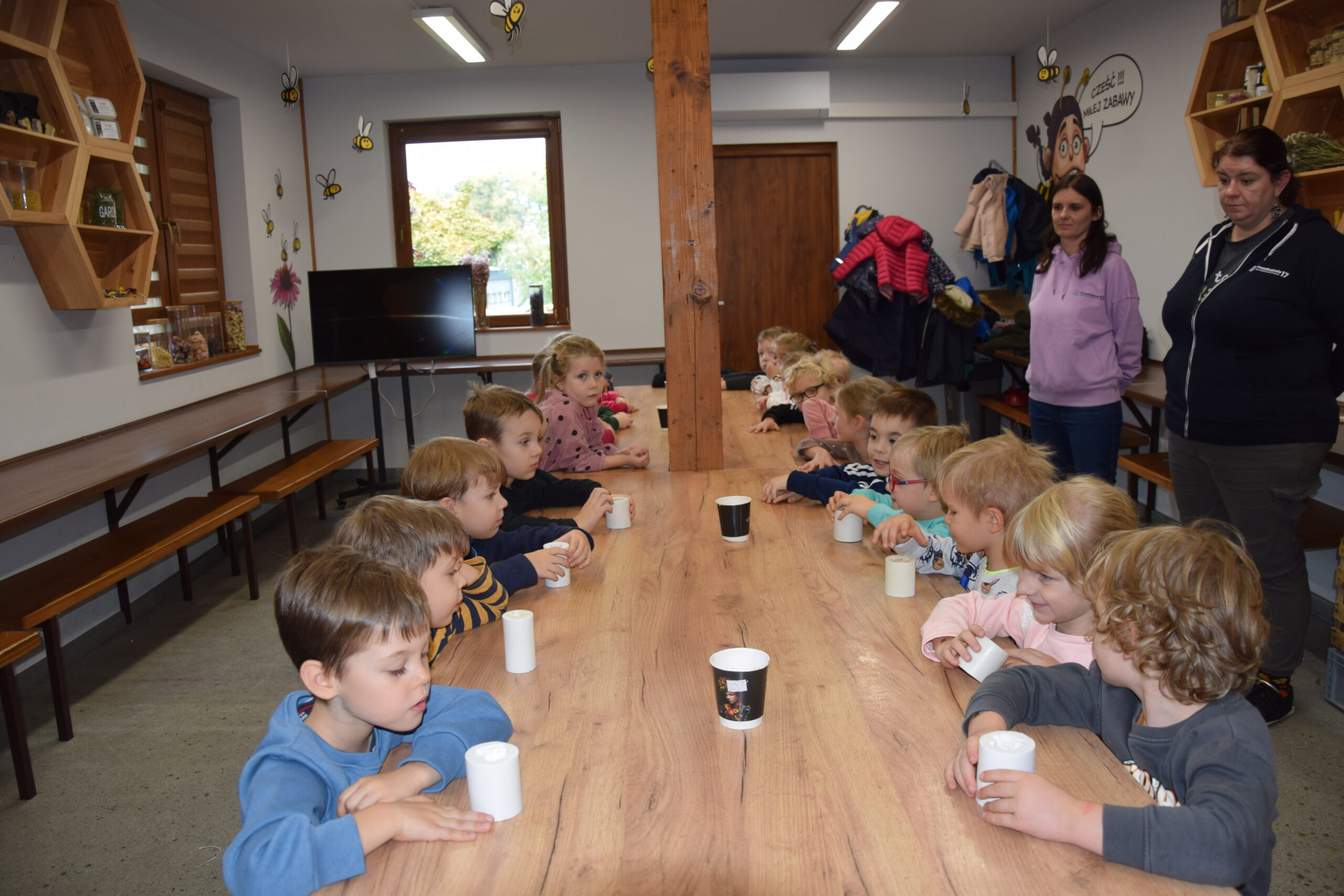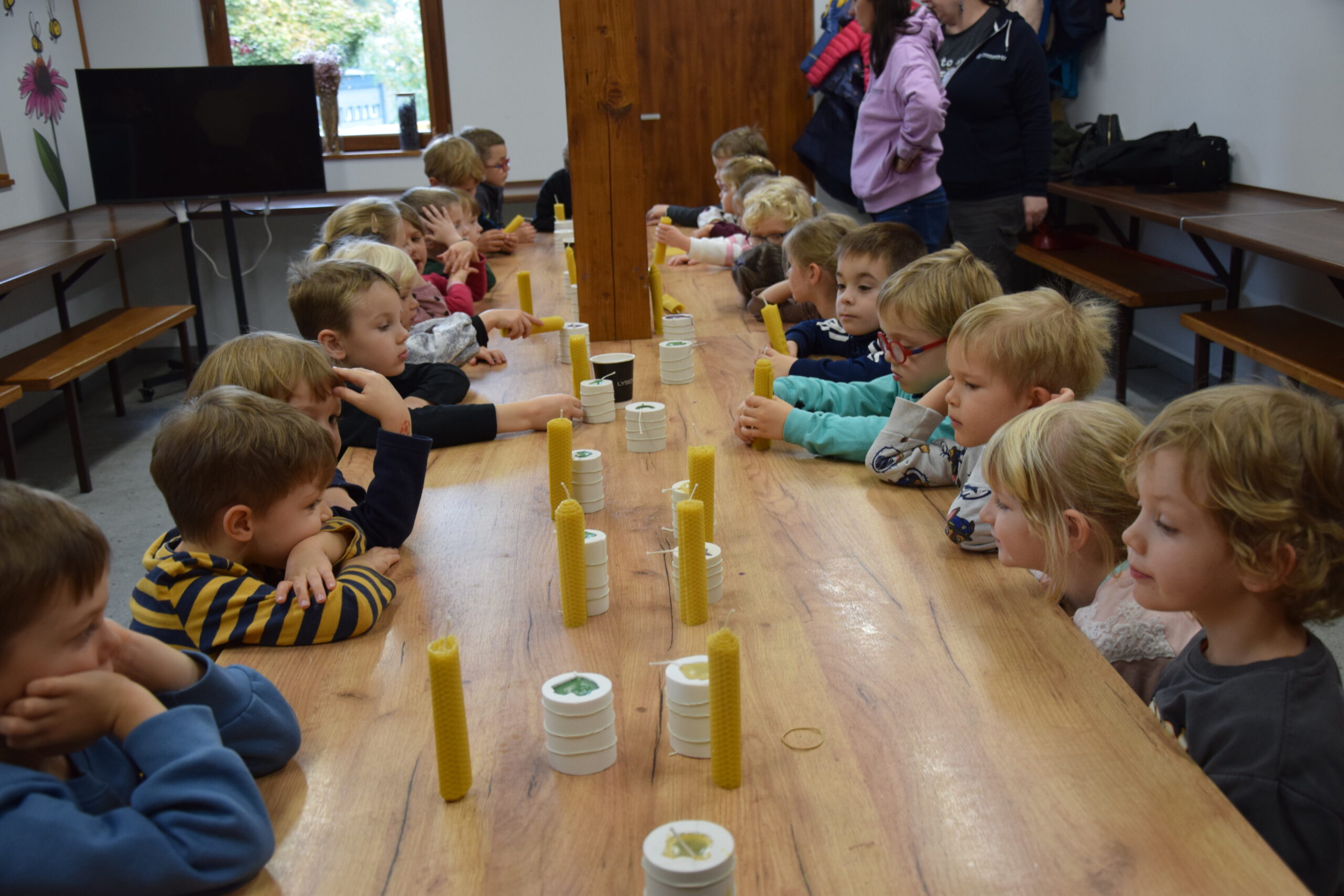 Grupa „Kamyczków” i „Kropelek” wybrała się do Apilandii – krainy pszczół. Przedszkolaki uczestniczyły w warsztatach robienia świec z wosku lanego i więzy pszczelej oraz degustacji pszczelich wyrobów. Dzieci zwiedzały także muzeum pszczelarskie i oglądały pszczoły w przeszklonym ulu.
