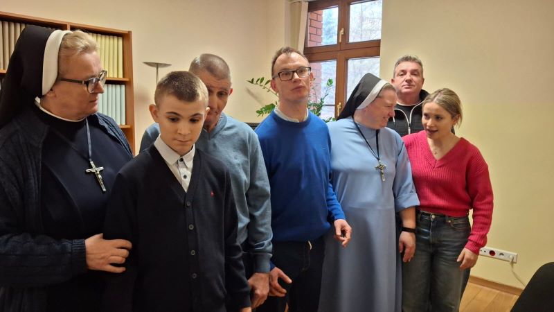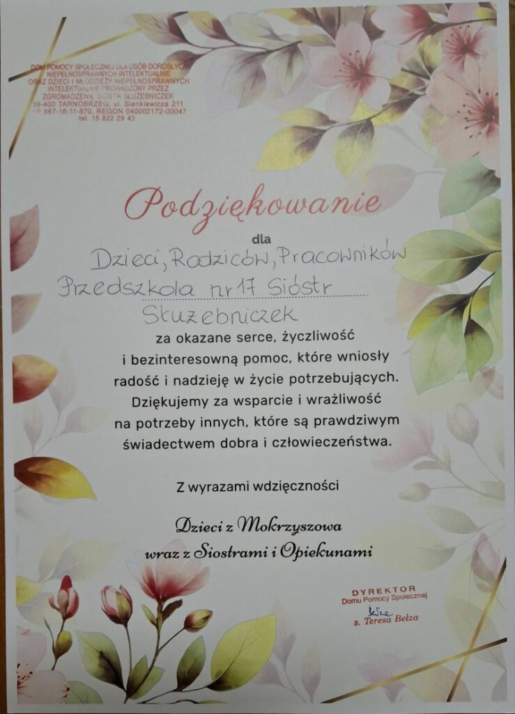 W minionym tygodniu nasze przedszkole odwiedzili Podopieczni prowadzonego przez Siostry Służebniczki Domu Pomocy Społecznej w Tarnobrzegu. Delegacja Wychowanków wraz z Siostrą Dyrektor Teresą Bełzą złożyła podziękowania dla rodziców, dzieci i pracowników przedszkola za życzliwość, bezinteresowną pomoc i zaangażowanie w zbiórkę wielkopostną na rzecz potrzebujących. Jako podziękowanie za otwarte serca przybyli Goście obdarowali przedszkolaki rozmaitymi słodkościami, a także drewnianymi zajączkami do własnoręcznego ozdobienia.