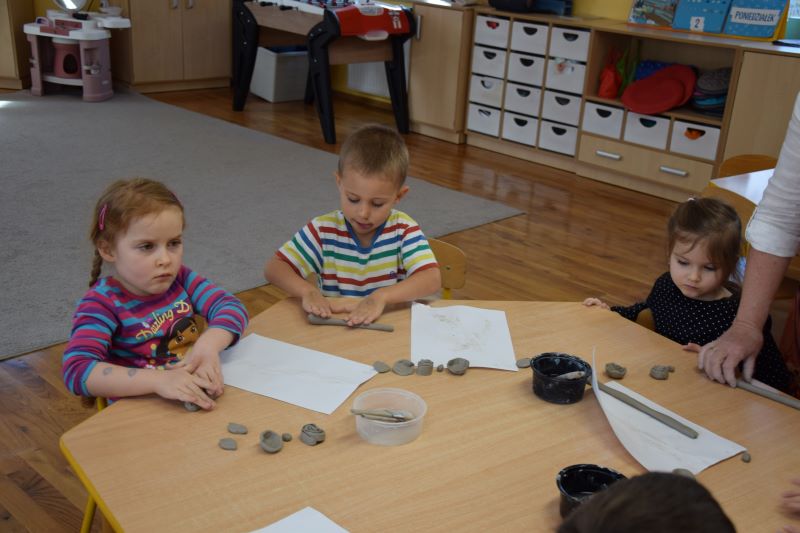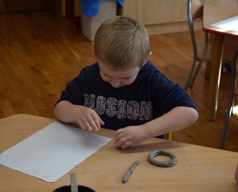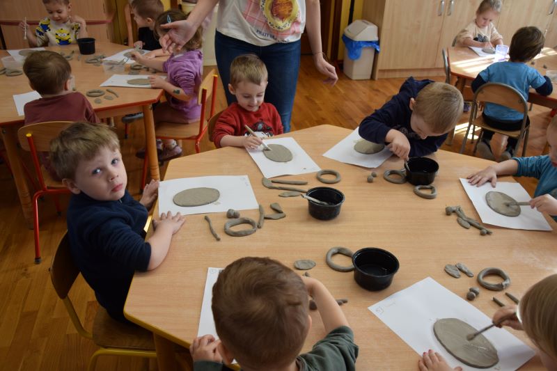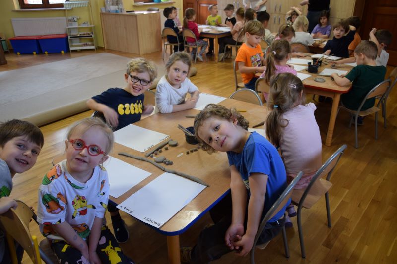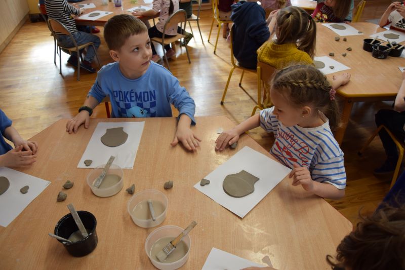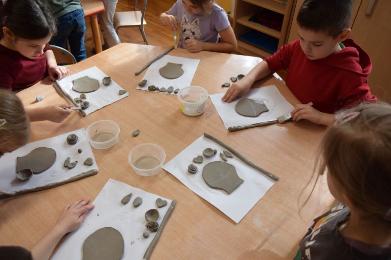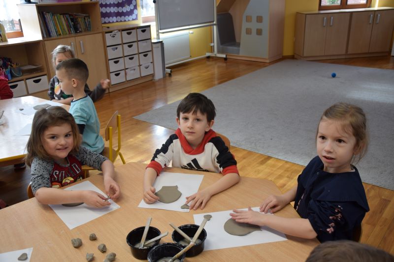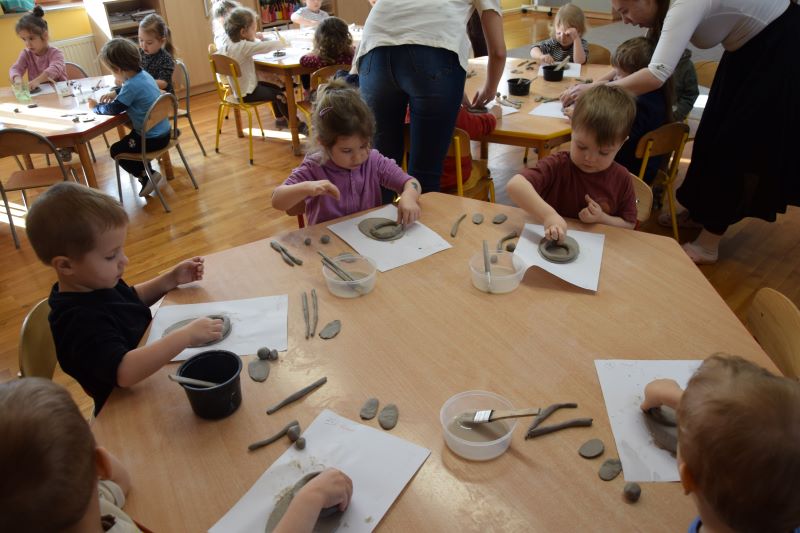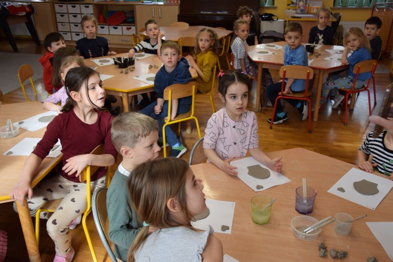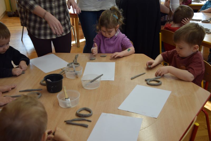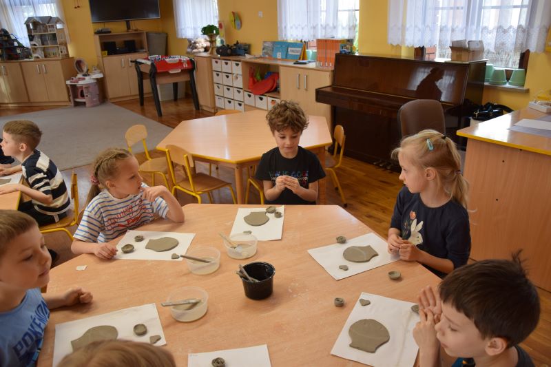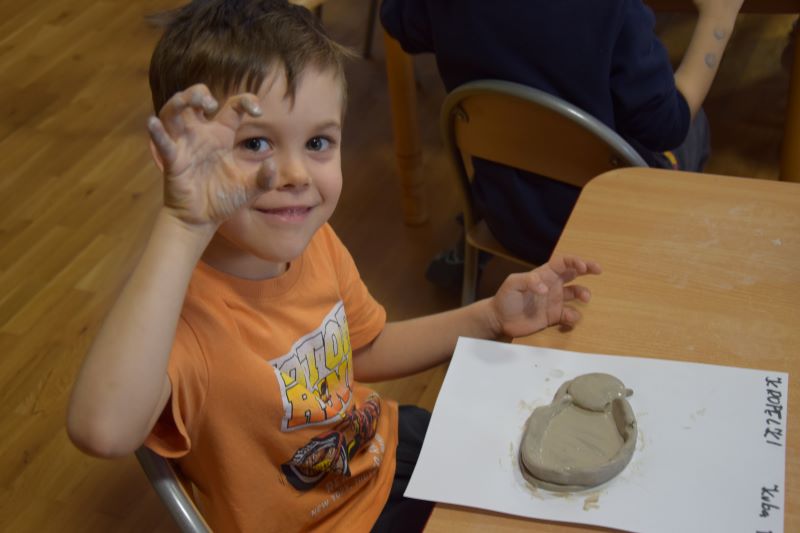 W naszym przedszkolu kolejny już raz odbyły się warsztaty ceramiczne. Przedszkolaki wykonały z gliny piękne kwiaty, koszyczki kwiatowe oraz kotki. Kontakt z gliną wpłynął na dzieci wyciszająco, a także usprawnił rozwój koncentracji uwagi. Podczas zajęć dzieci rozwijały swoją samodzielność i cierpliwość, a także doskonaliły sprawność motoryki małej.