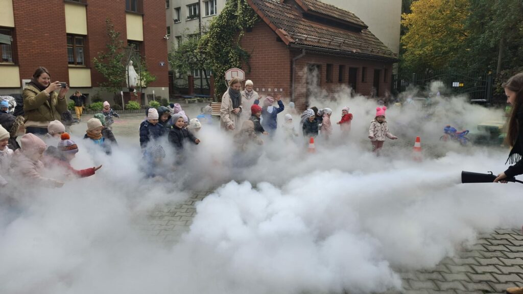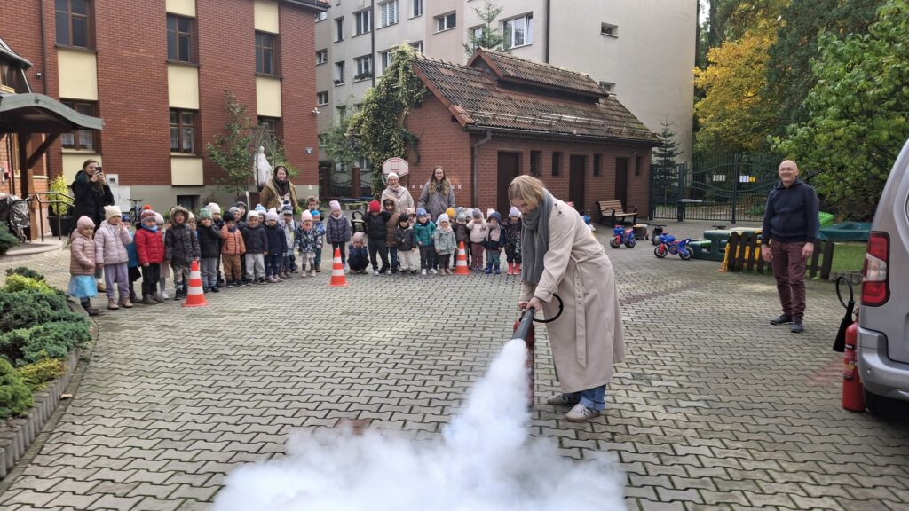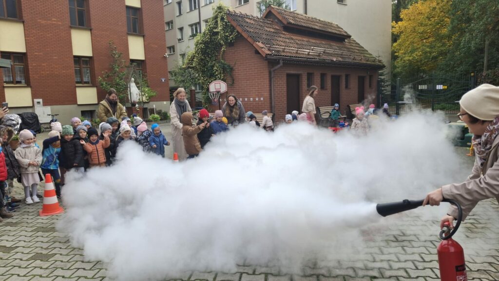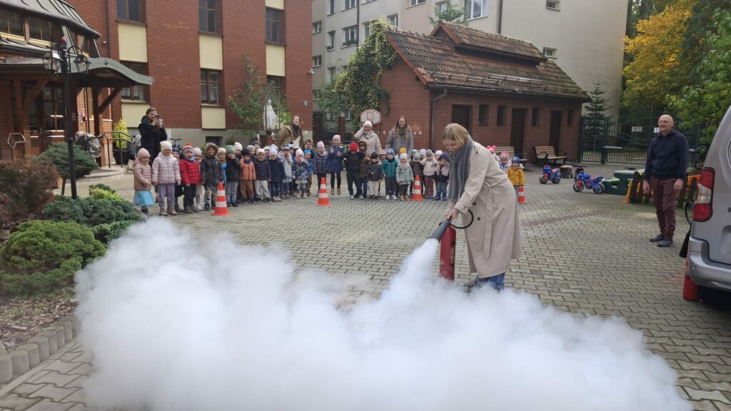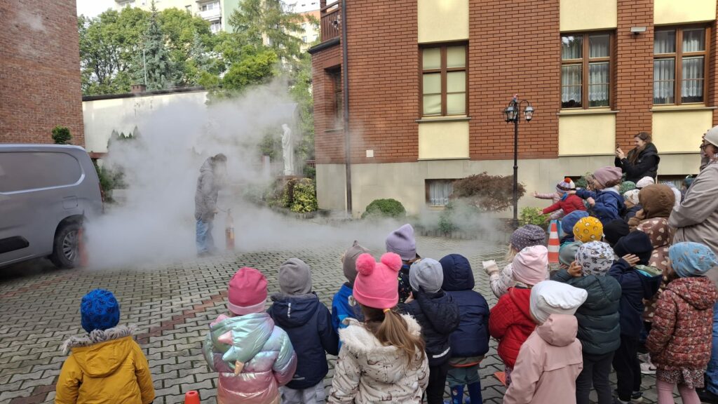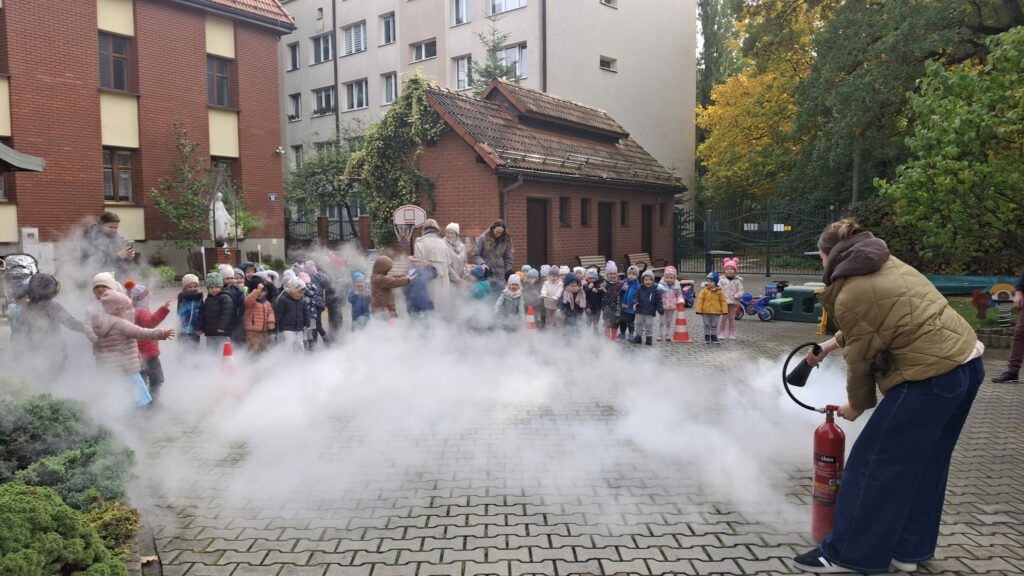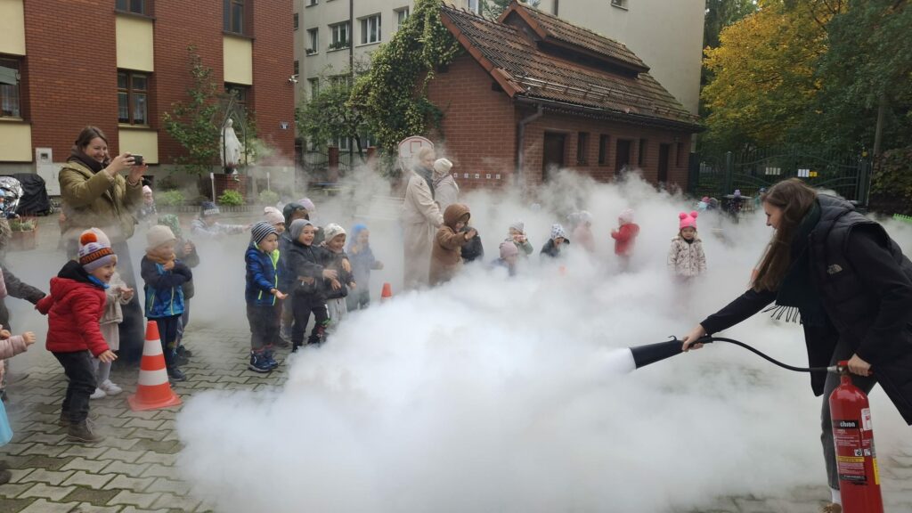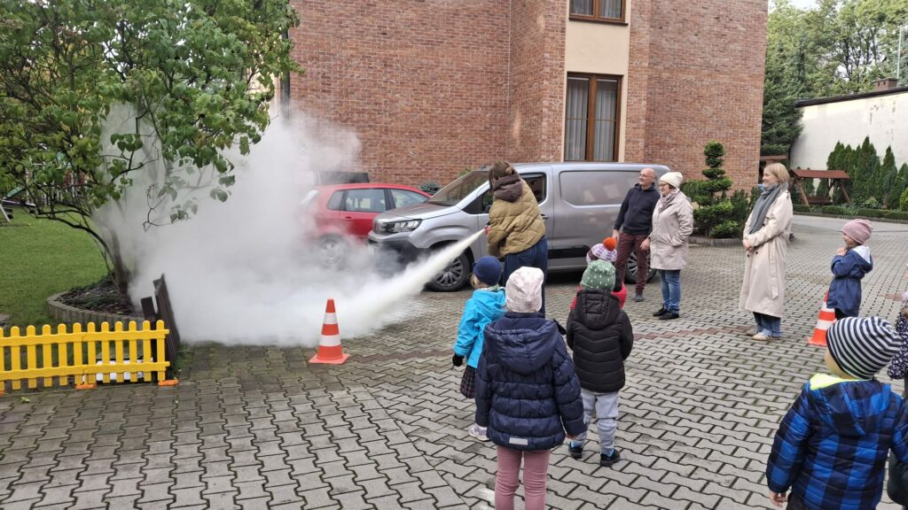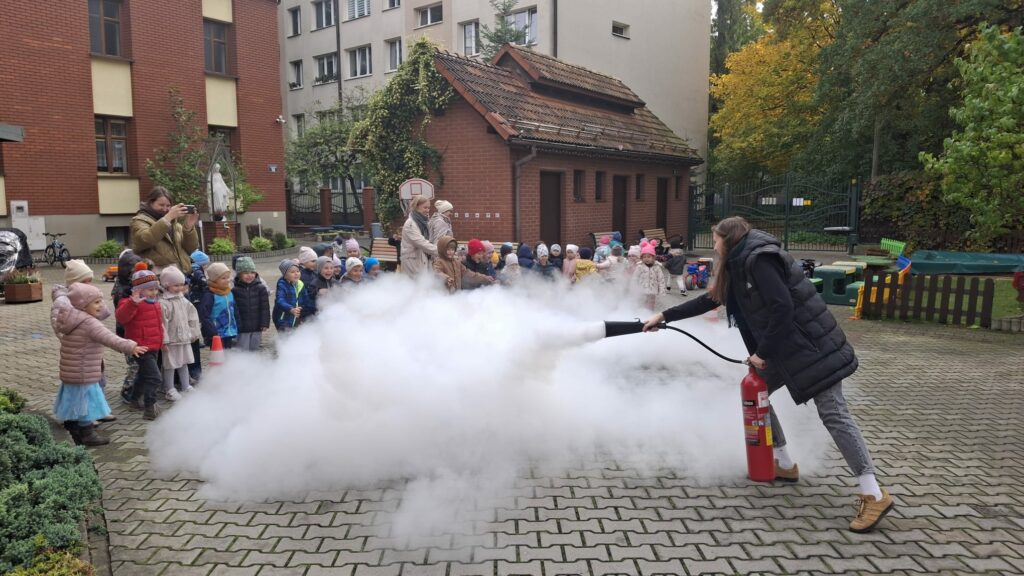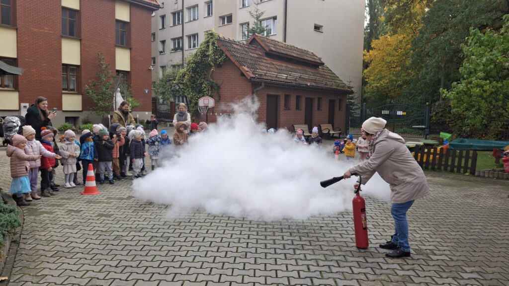 Pod okiem zawodowego strażaka przeprowadziliśmy próbną ewakuację, a nasze Panie nauczyły się gasić pożar. Z przedszkola udało nam się wyjść bardzo szybko i mogliśmy się cieszyć, że to tylko ćwiczenie, zabawa i śniegowa mgła.