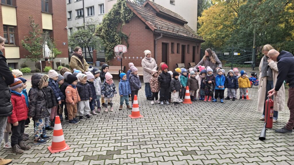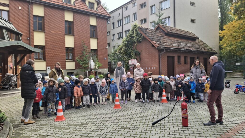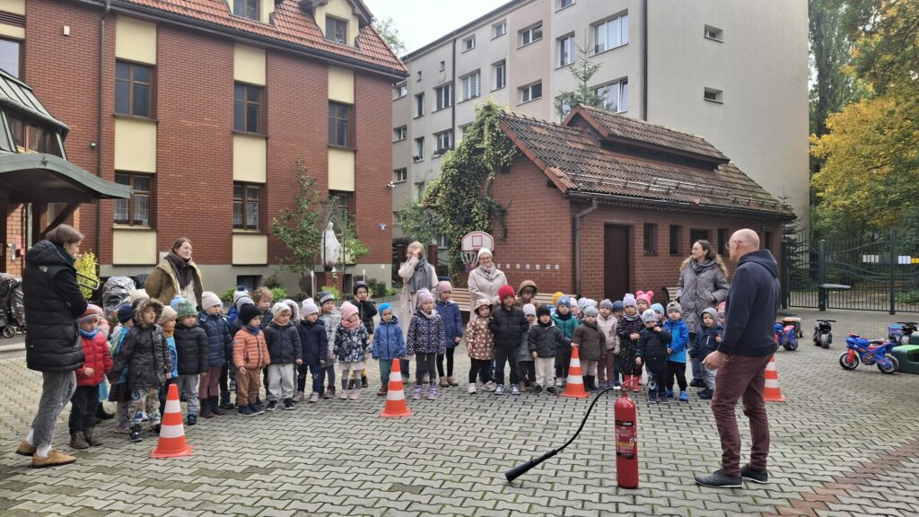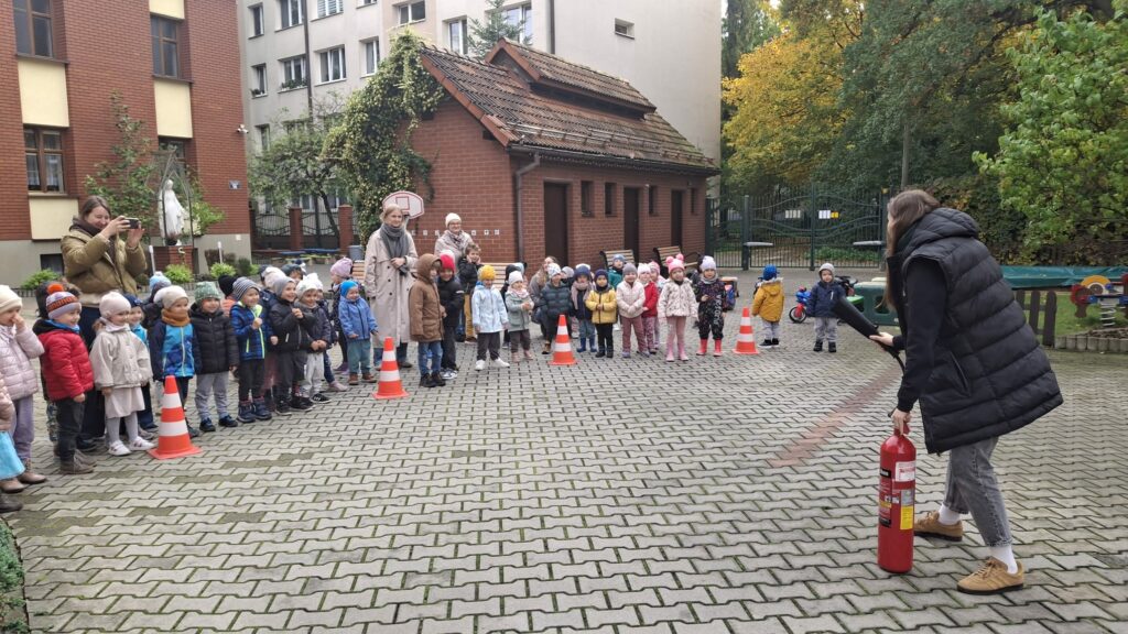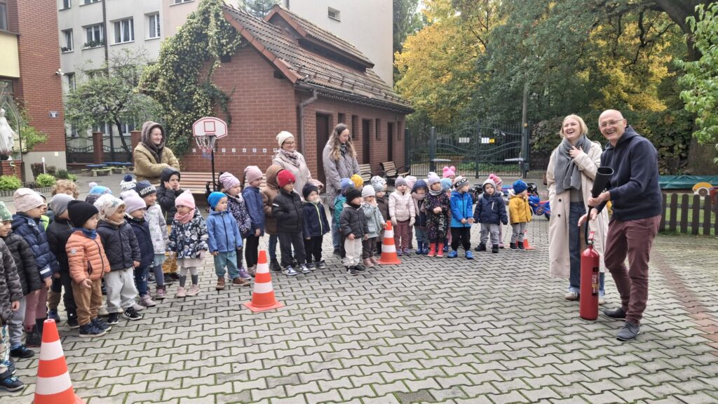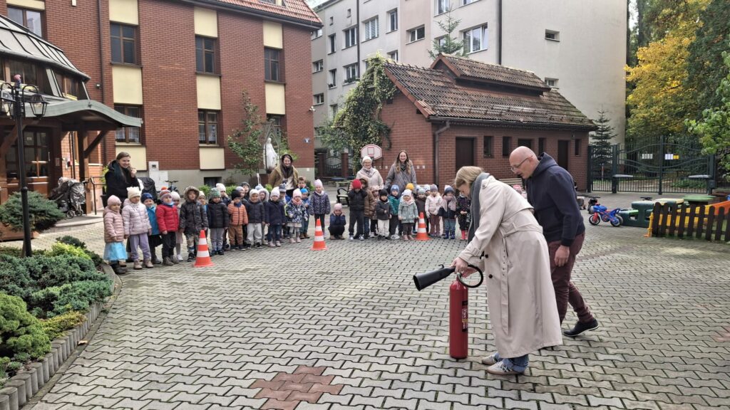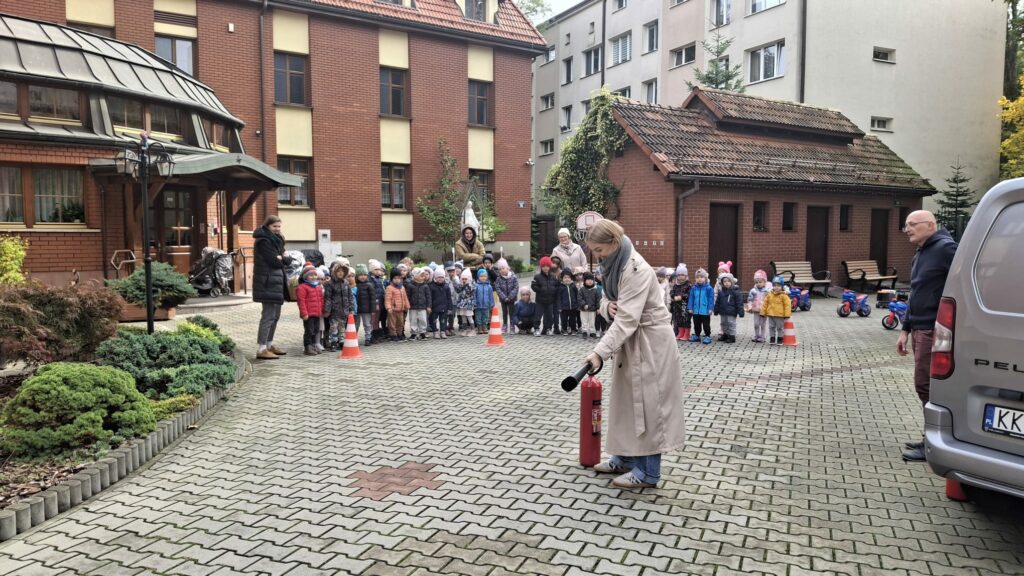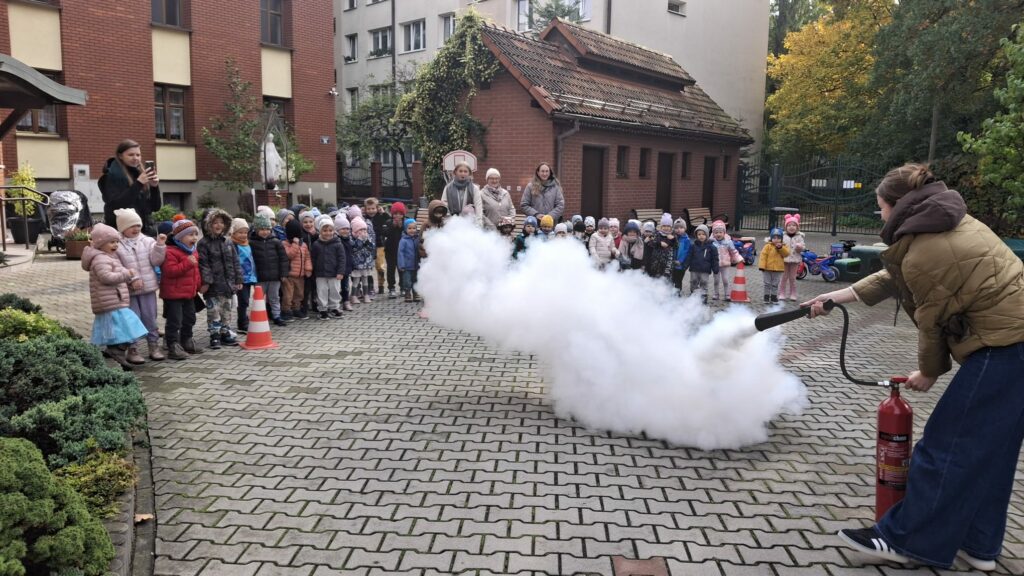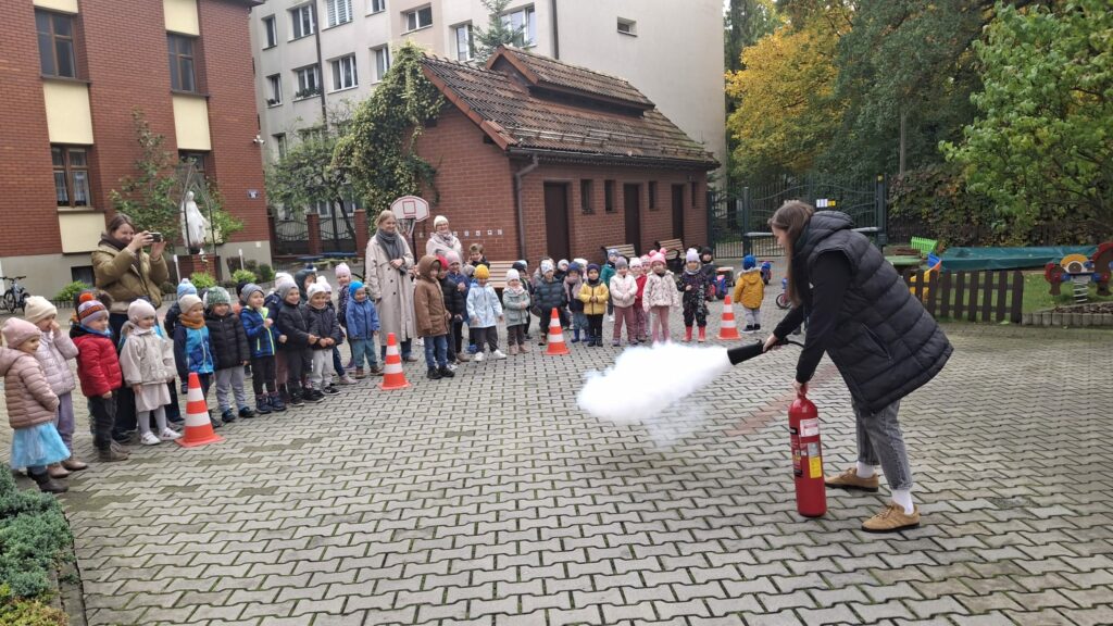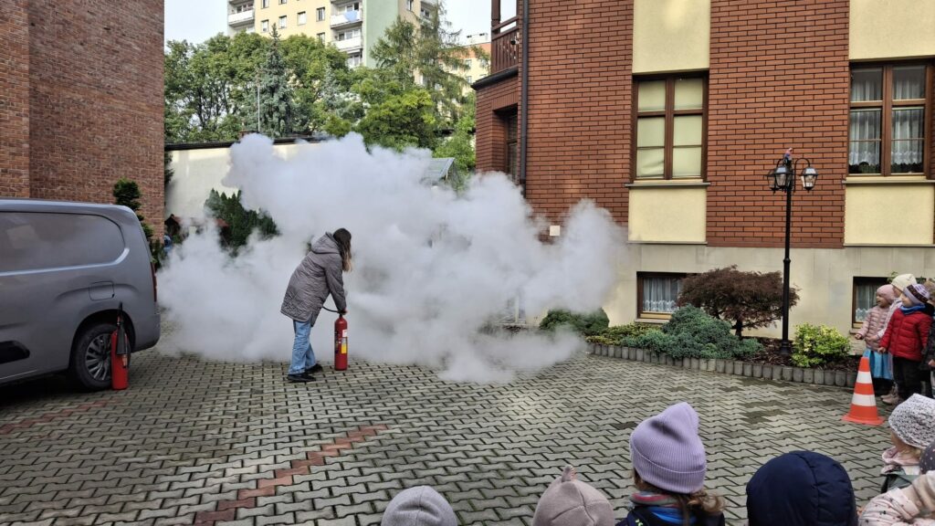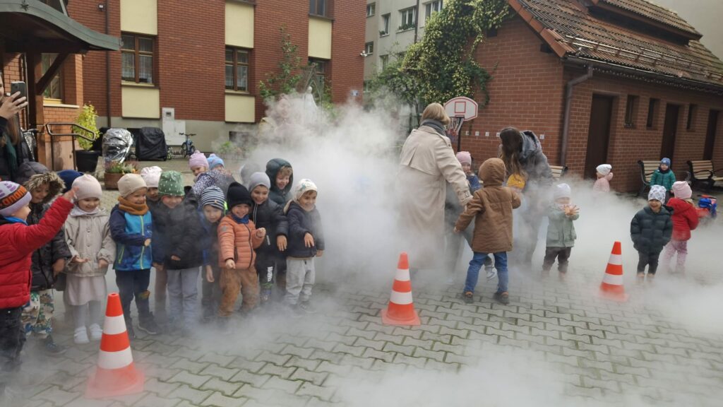 Pod okiem zawodowego strażaka przeprowadziliśmy próbną ewakuację, a nasze Panie nauczyły się gasić pożar. Z przedszkola udało nam się wyjść bardzo szybko i mogliśmy się cieszyć, że to tylko ćwiczenie, zabawa i śniegowa mgła.