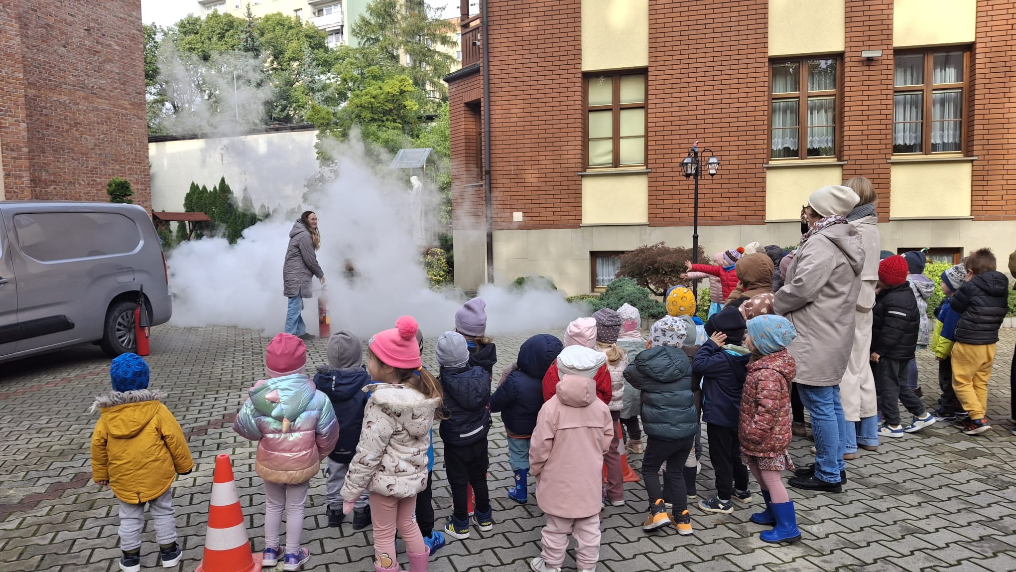 Pod okiem zawodowego strażaka przeprowadziliśmy próbną ewakuację, a nasze Panie nauczyły się gasić pożar. Z przedszkola udało nam się wyjść bardzo szybko i mogliśmy się cieszyć, że to tylko ćwiczenie, zabawa i śniegowa mgła.