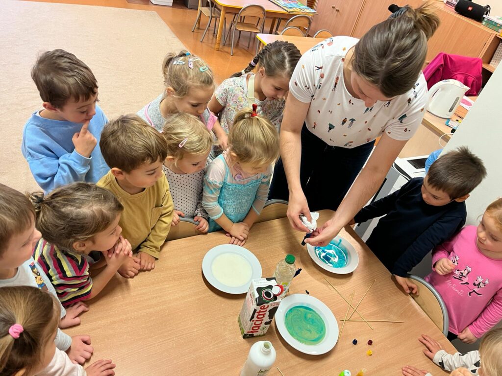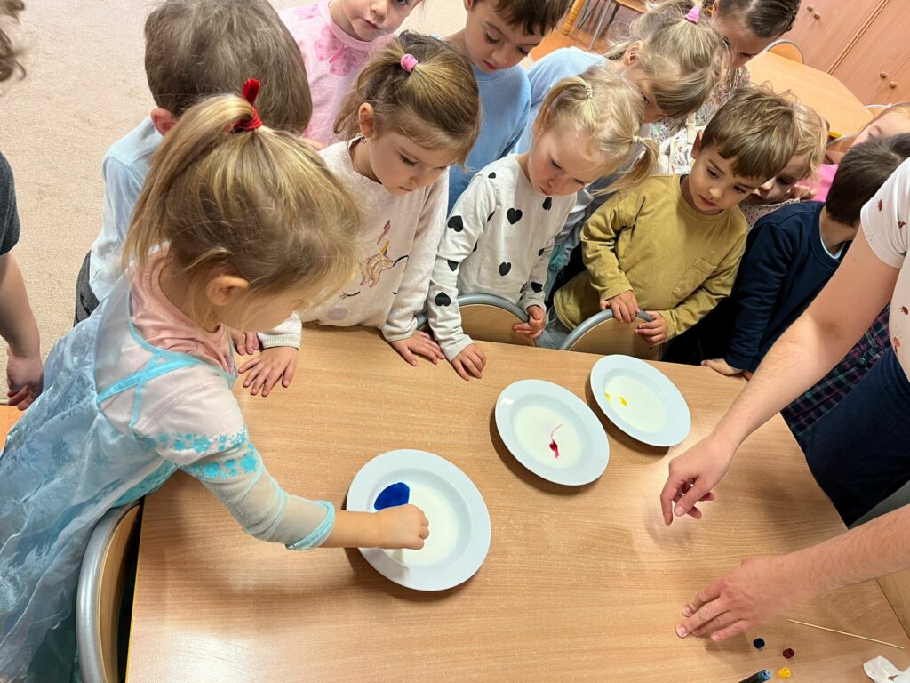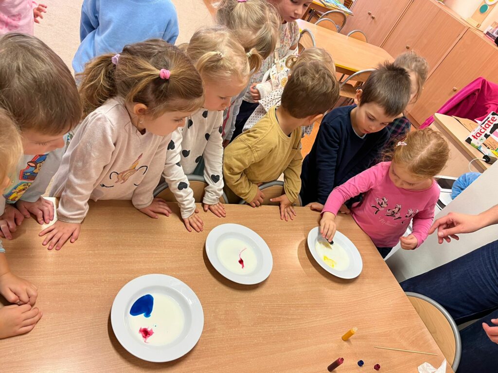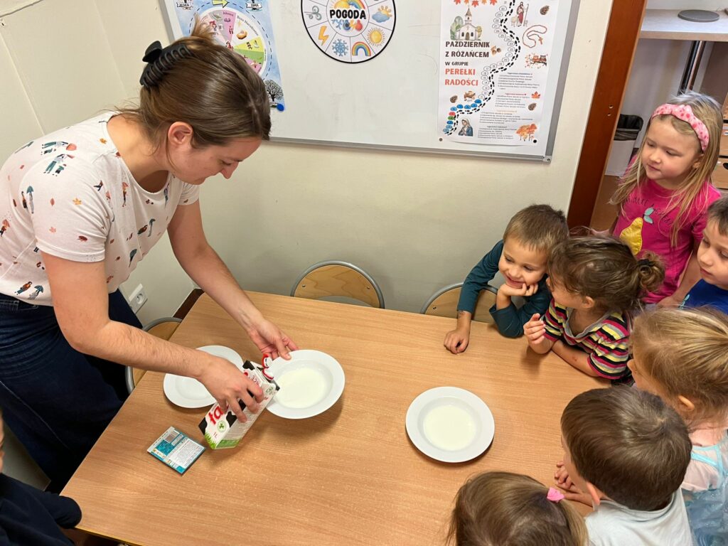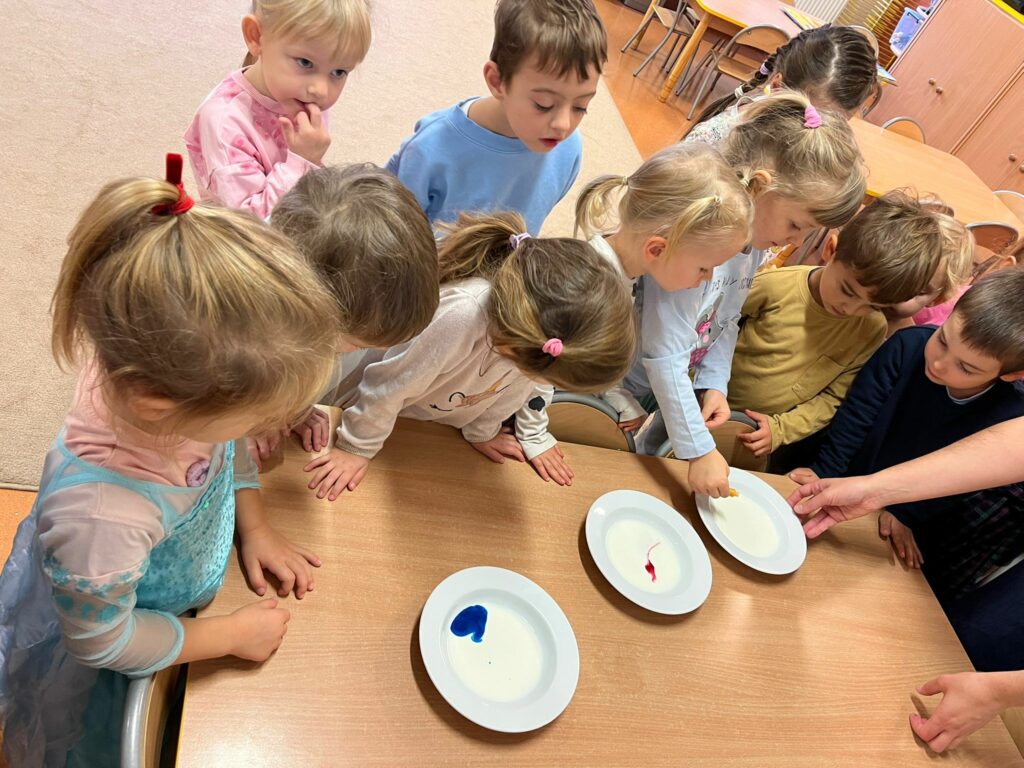 Przedszkolaki z grupy „Perełki radości” wzięły udział w niezwykle interesujących zajęciach badawczych, podczas których odkrywały tajemnice mleka. Najpierw dzieci dowiedziały się, skąd pochodzi mleko- poznały krowę jako jego główne źródło oraz drogę, jaką mleko pokonuje z gospodarstwa do sklepu. Następnie dzieci z zaciekawieniem obserwowały eksperyment z octem – po jego dodaniu mleko się ścinało, tworząc biały twarożek, co stało się świetnym punktem wyjścia do rozmowy o produkcji sera. Kolejnym etapem było sprawdzenie, czy mleko można zabarwić. Dzieci podczas zajęć stworzyły na mleku kolorowe wiry. Na zakończenie rozmawialiśmy o innych ciekawych doświadczeniach, jakie można wykonać z mlekiem. Zajęcia były pełne radości, zadziwienia i nauki przez zabawę – „Perełki” z entuzjazmem dzieliły się swoimi odkryciami.
