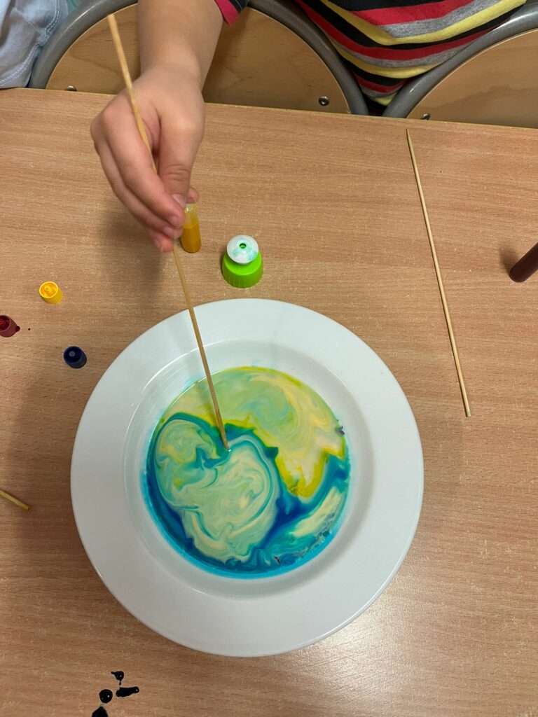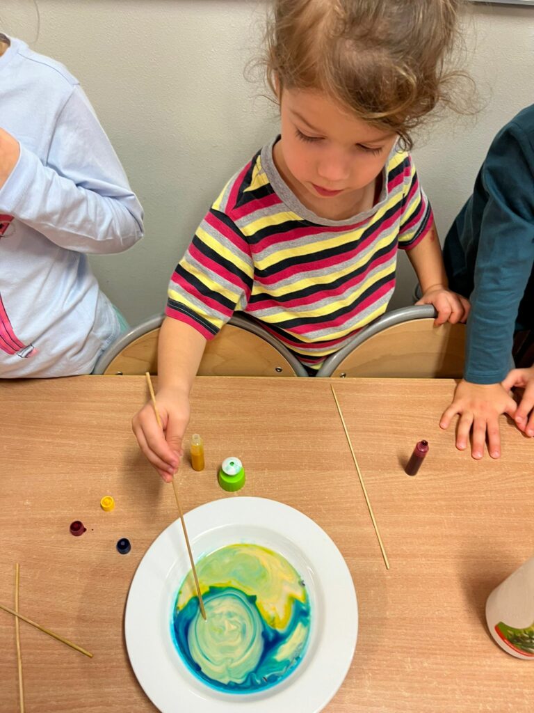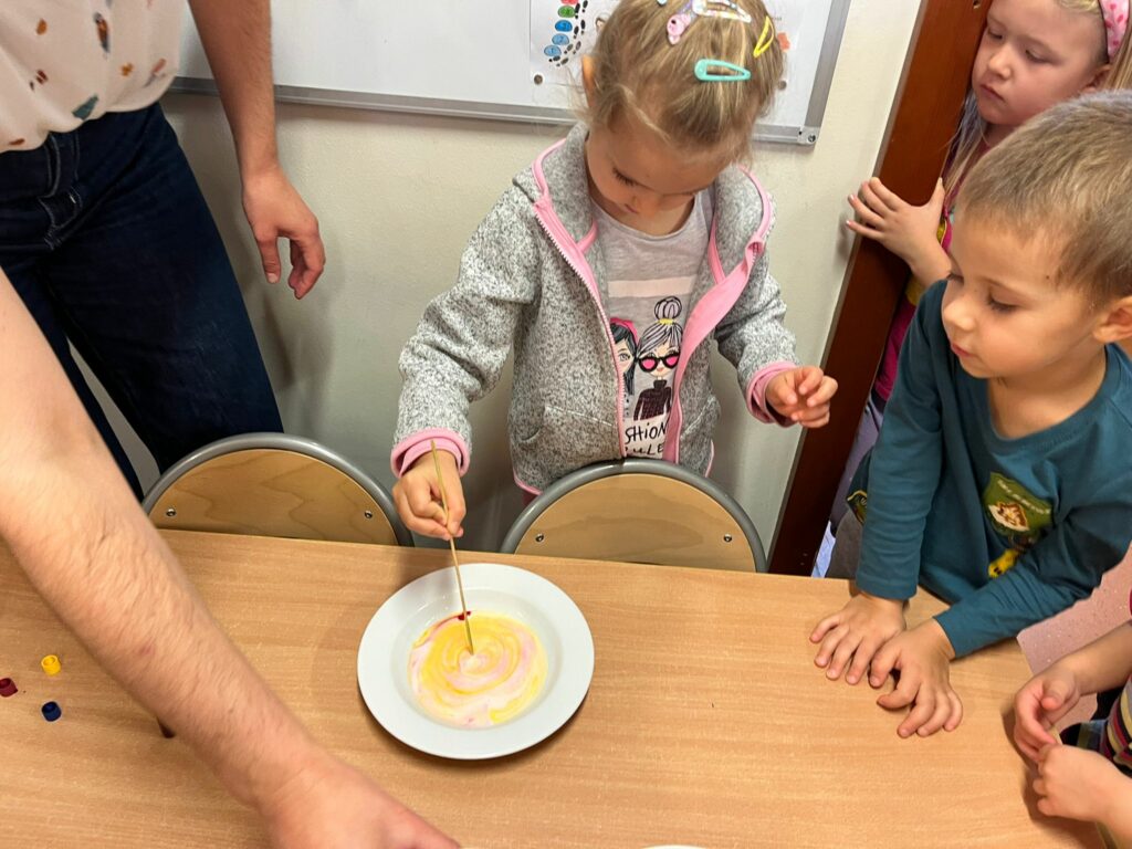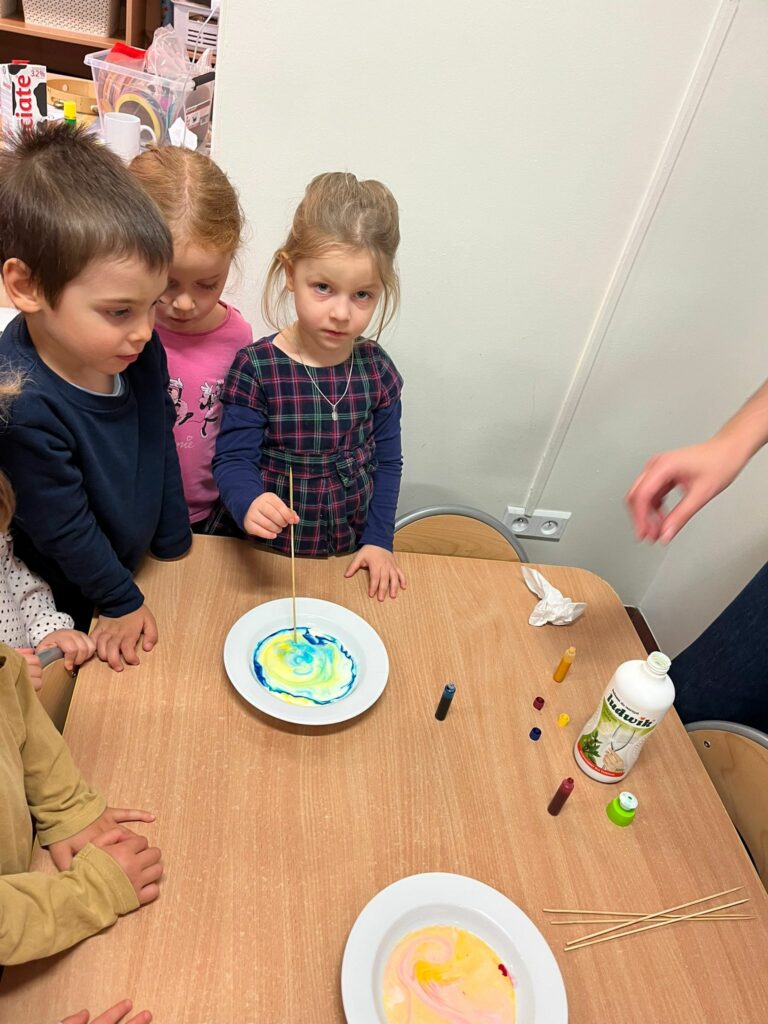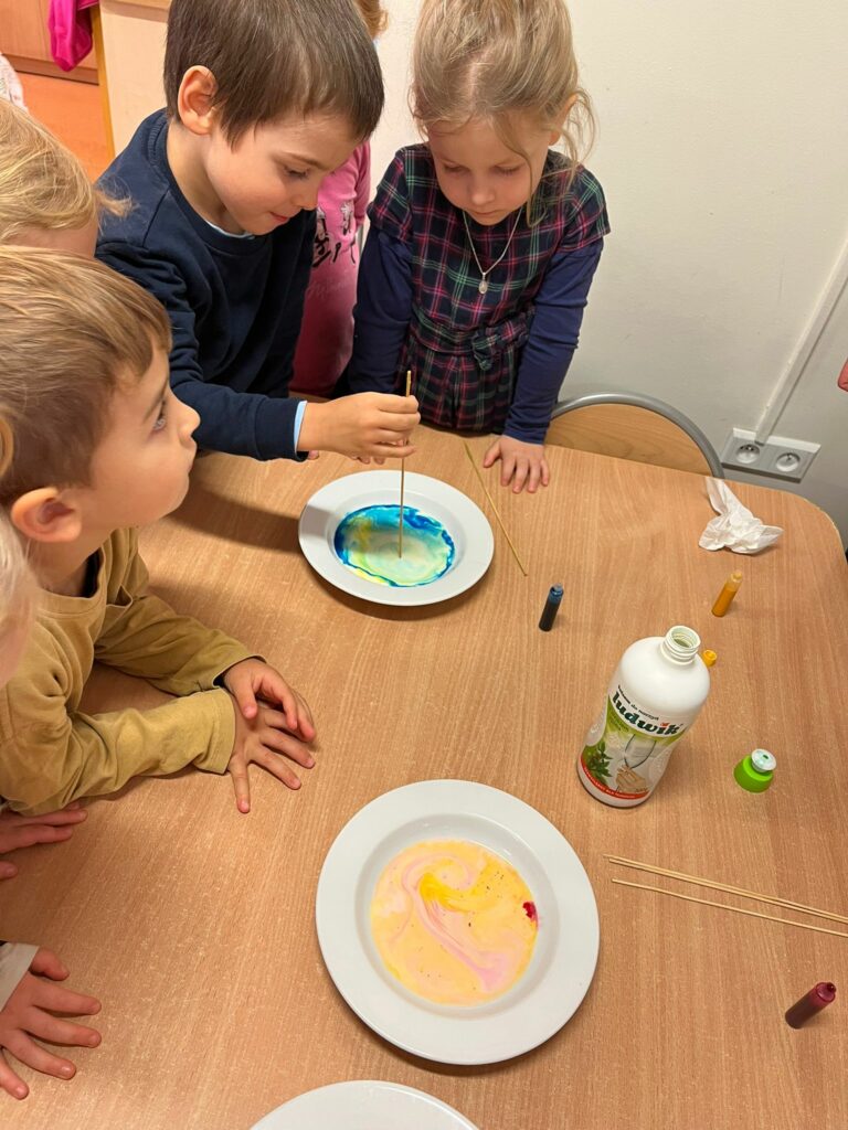Przedszkolaki z grupy „Perełki radości” wzięły udział w niezwykle interesujących zajęciach badawczych, podczas których odkrywały tajemnice mleka. Najpierw dzieci dowiedziały się, skąd pochodzi mleko- poznały krowę jako jego główne źródło oraz drogę, jaką mleko pokonuje z gospodarstwa do sklepu. Następnie dzieci z zaciekawieniem obserwowały eksperyment z octem – po jego dodaniu mleko się ścinało, tworząc biały twarożek, co stało się świetnym punktem wyjścia do rozmowy o produkcji sera. Kolejnym etapem było sprawdzenie, czy mleko można zabarwić. Dzieci podczas zajęć stworzyły na mleku kolorowe wiry. Na zakończenie rozmawialiśmy o innych ciekawych doświadczeniach, jakie można wykonać z mlekiem. Zajęcia były pełne radości, zadziwienia i nauki przez zabawę – „Perełki” z entuzjazmem dzieliły się swoimi odkryciami.
