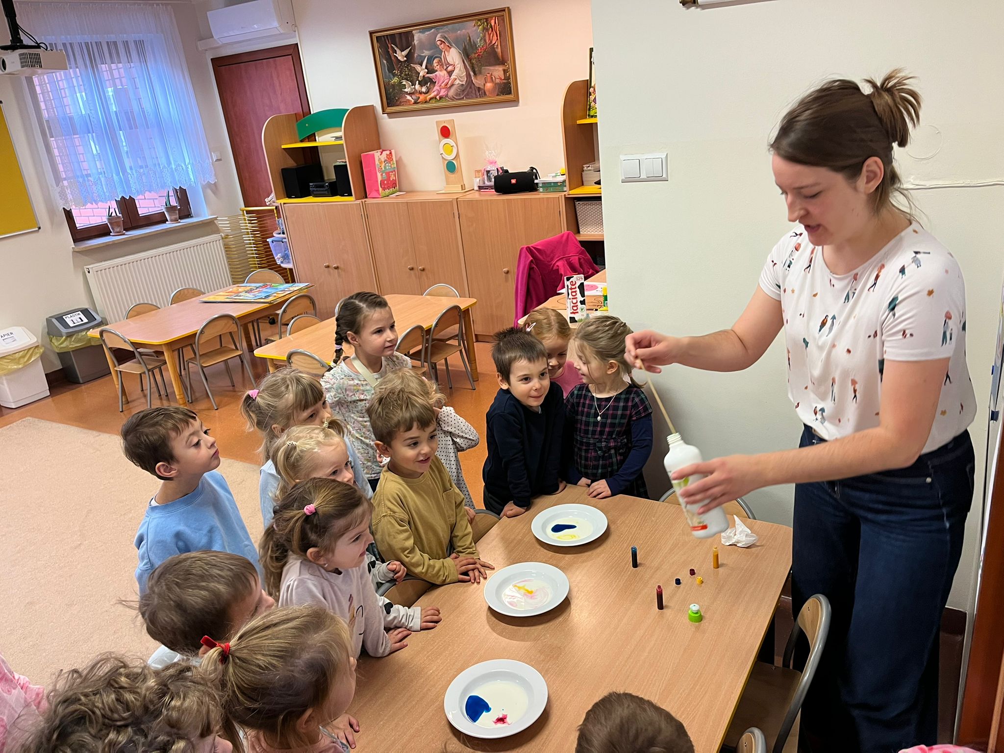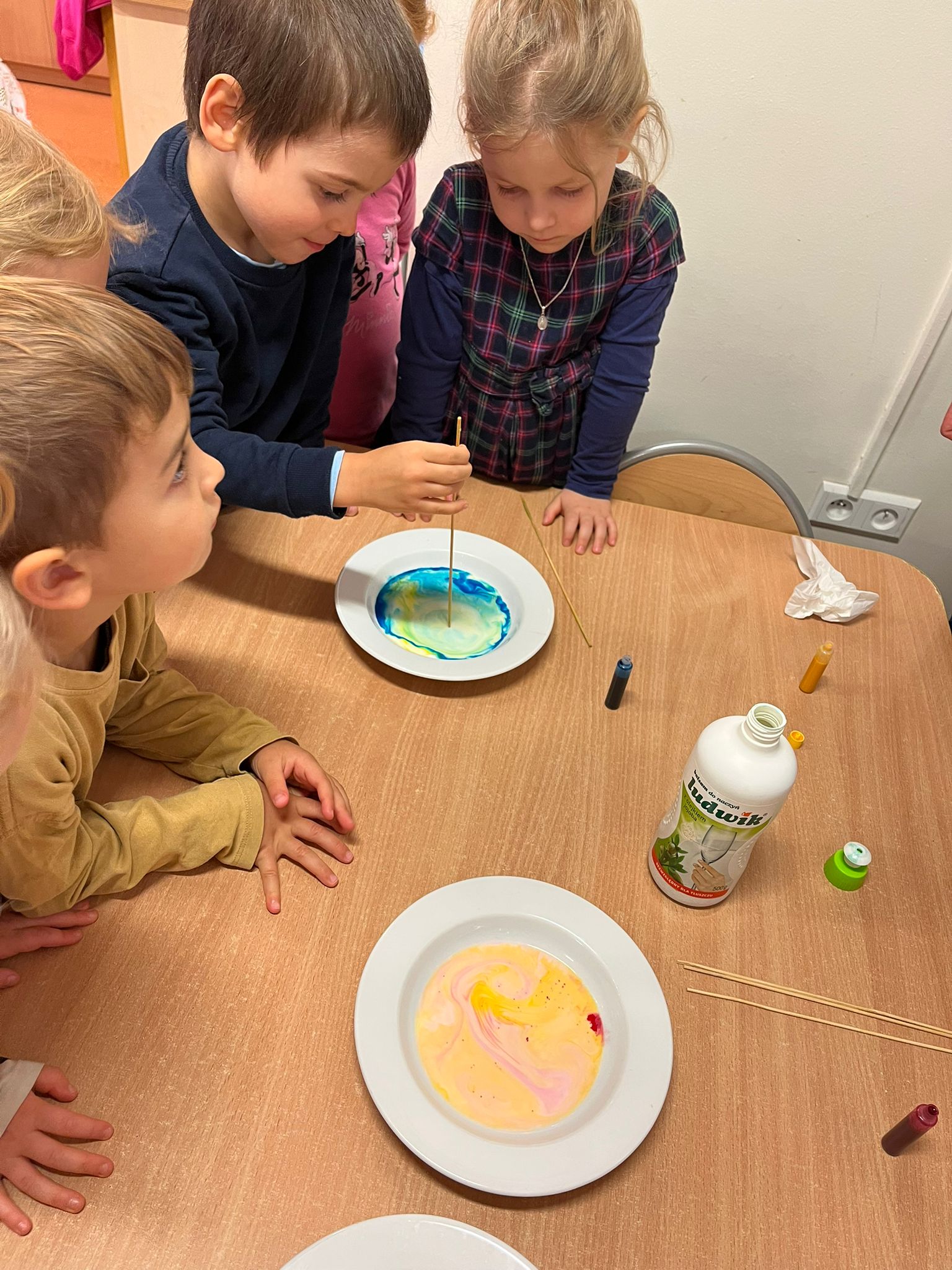 Przedszkolaki z grupy „Perełki radości” wzięły udział w niezwykle interesujących zajęciach badawczych, podczas których odkrywały tajemnice mleka. Najpierw dzieci dowiedziały się, skąd pochodzi mleko- poznały krowę jako jego główne źródło oraz drogę, jaką mleko pokonuje z gospodarstwa do sklepu. Następnie dzieci z zaciekawieniem obserwowały eksperyment z octem – po jego dodaniu mleko się ścinało, tworząc biały twarożek, co stało się świetnym punktem wyjścia do rozmowy o produkcji sera. Kolejnym etapem było sprawdzenie, czy mleko można zabarwić. Dzieci podczas zajęć stworzyły na mleku kolorowe wiry. Na zakończenie rozmawialiśmy o innych ciekawych doświadczeniach, jakie można wykonać z mlekiem. Zajęcia były pełne radości, zadziwienia i nauki przez zabawę – „Perełki” z entuzjazmem dzieliły się swoimi odkryciami.