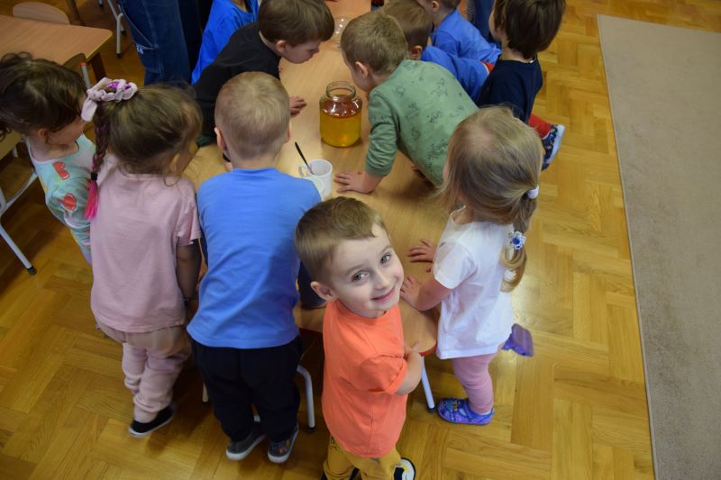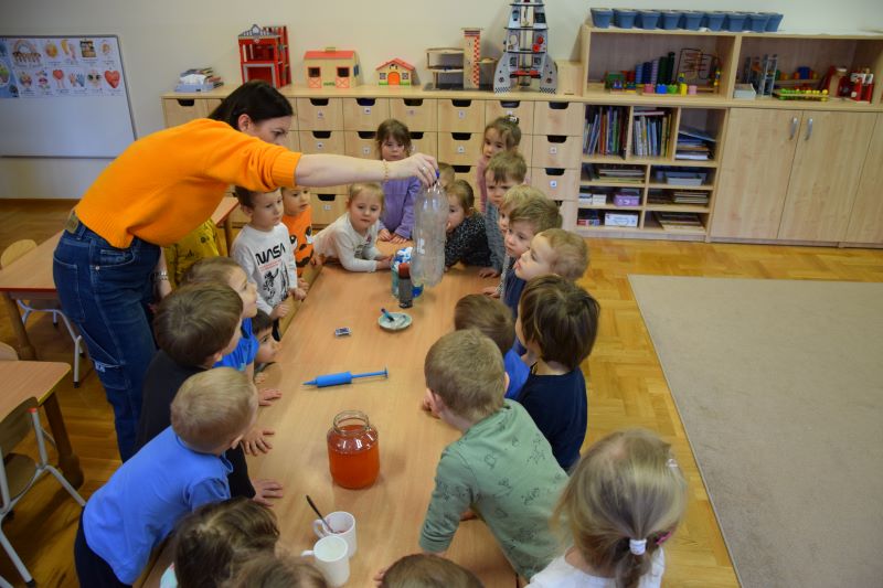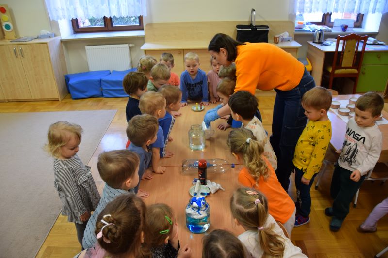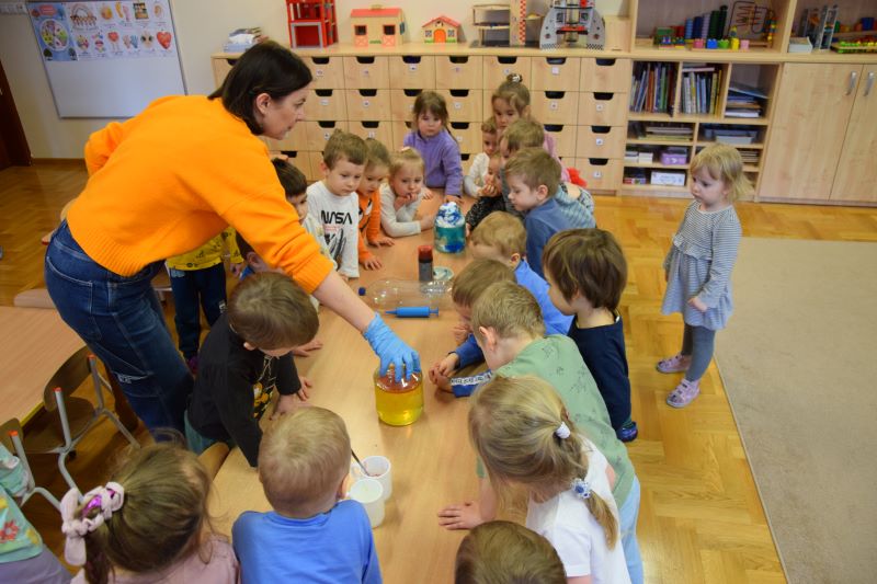 Nasze najmłodsze przedszkolaki z grupy „Promyki Nadziei” podczas zajęć wykonały eksperyment „Deszcz w słoiku”. Dzieci stworzyły chmurę z pianki do golenia, a następnie dodawały barwniki, które po chwili opadały do wody jak deszcz. Dzięki temu dzieci mogły zaobserwować, jak powstaje chmura i opady.