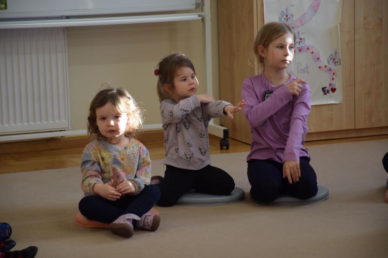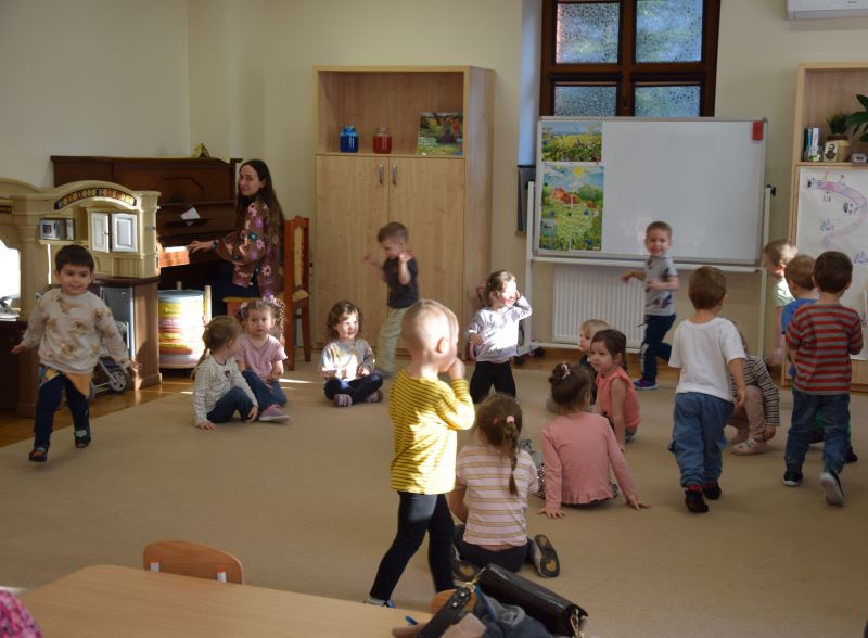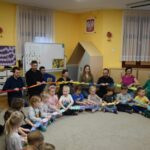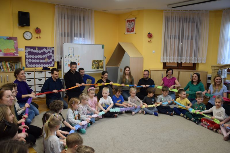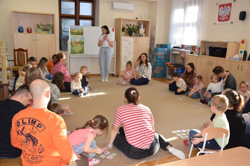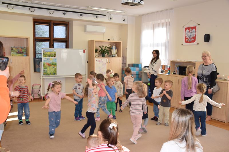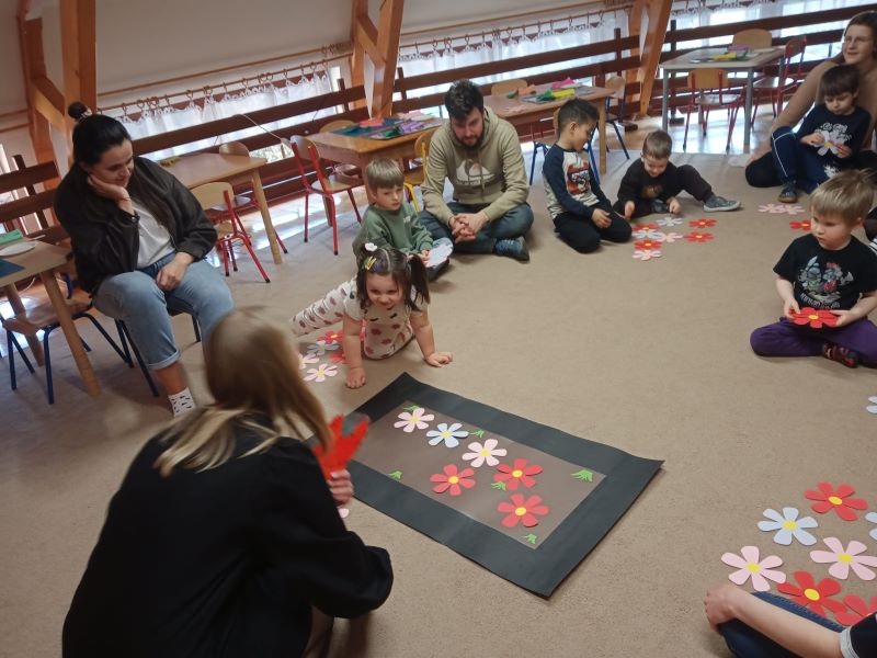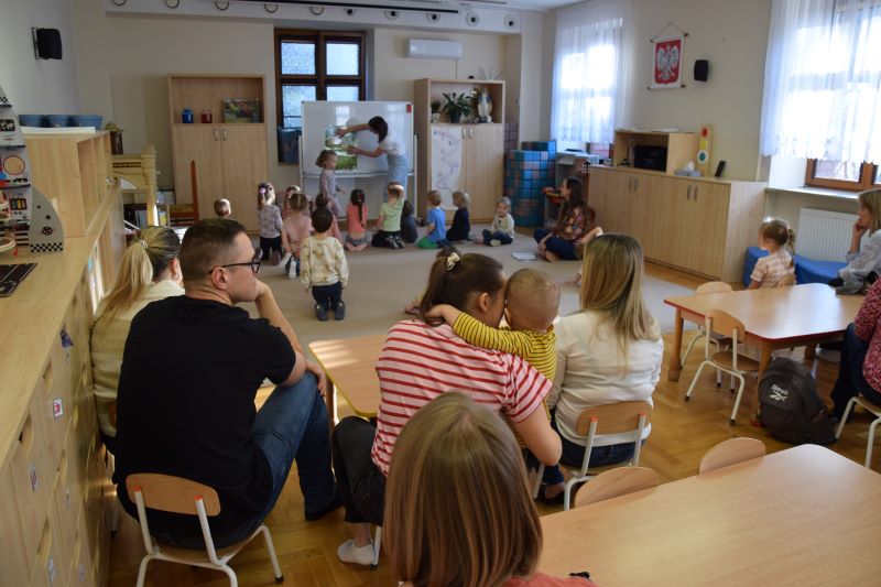 Na zajęciach otwartych pt. „Na wiosennej łące” dzieci poznawały mieszkańców łąki. Układały owady w szeregu, przeliczały je oraz szukały różnic na obrazkach. Był także czas na wspólną zabawę ruchową „Trzmiele i motylki”, a także zabawę paluszkową „Gąsienica i pająk”. Następnie dzieci zaśpiewały piosenkę „Wiosna w błękitnej sukience”. Rodzice mieli możliwość zaobserwować pracę dzieci podczas zajęć oraz towarzyszyć im w wykonywaniu zadań.